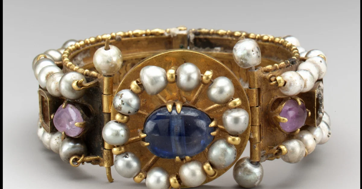 Gold bracelet decorated with silver, pearls, amethyst, sapphire, glass, and quartz, 500-700. 3.8 x 8.2 cm.