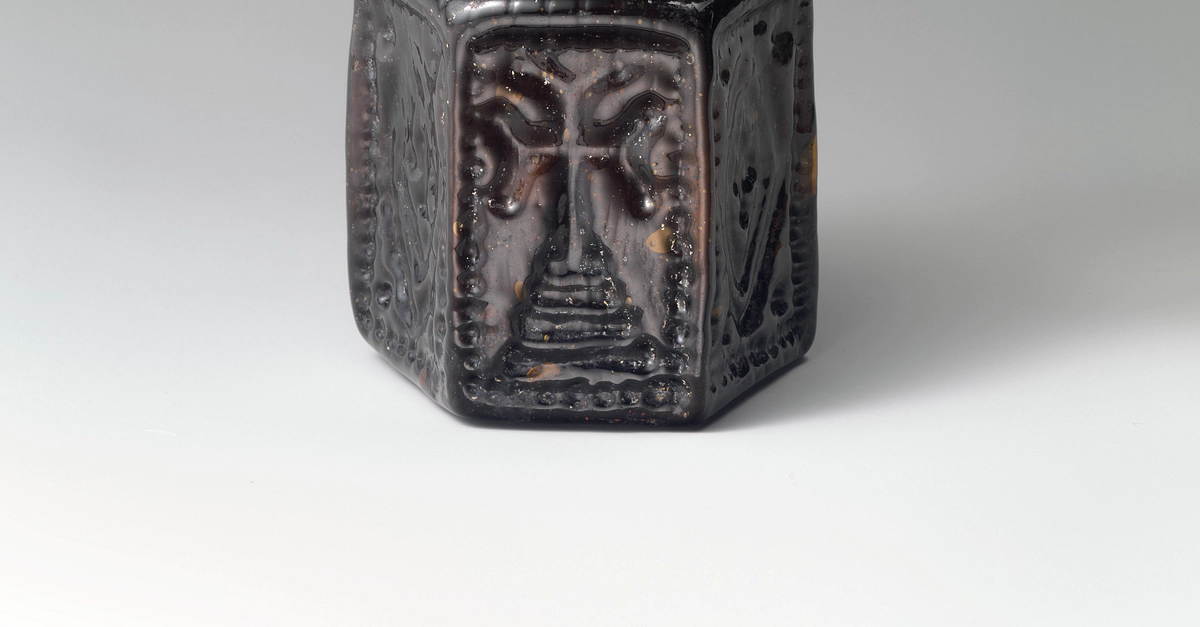 Created in the 6th or 7th century CE, this moulded glass jug measures 15.1 x 8.6 x 7.5 cm. This photo shows a stepped cross, representing one constructed at the site of Jesus' crucifixion by Thoedosius II. The relief designs were produced by blowing molten glass into a mold. (Metropolitan Museum of Art, New York)