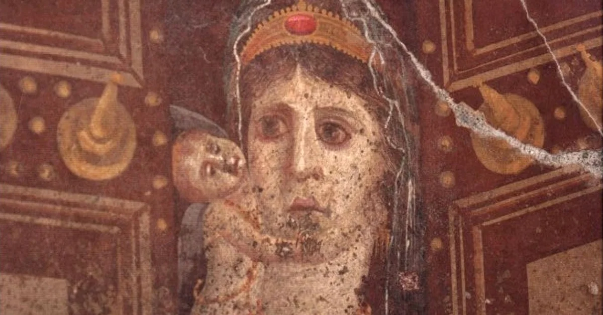 This mid-1st Century BCE mural portrays a statue of Venus and the infant Cupid in the Temple of Venus Genitrix, Rome. The statue has been identified as the infamous gilded statue of Cleopatra VII as Venus that Julius Caesar unveiled during the temple's dedication in 46 BCE. The depiction of Caesarion, Cleopatra’s son by Caesar, would have been controversial following Cleopatra's defeat by Octavian at the Battle of Actium in 31 BCE. Although Octavian spared Cleopatra's statues, Caesarion remained a delicate subject, which explains why the owner hid the mural behind a brick wall. (The House of Marcus Fabius Rufius, Pompeii)