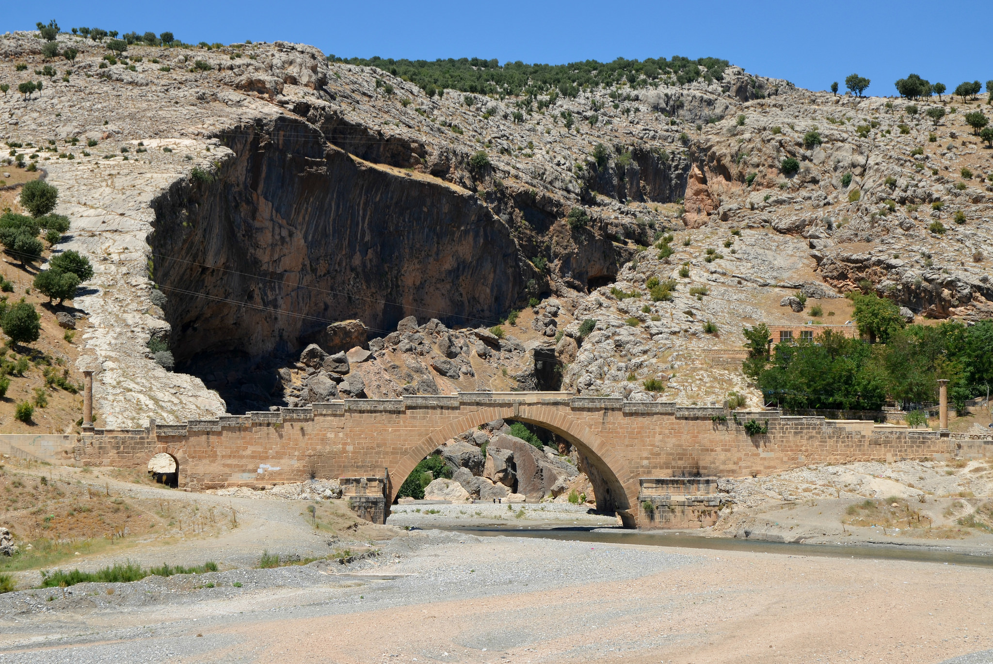 The Severan Bridge (also known as Cendere Bridge) is a Roman bridge located near the ancient city of Arsameia (today Eskikale), 55 km (34 miles) north east of Adıyaman in southeastern Turkey. It spans the Cendere Çayı river, which was known as Chabines in antiquity. Built by the Sixteenth Roman legion stationed at Samosata (Samsat) in the last years of the 2nd century CE, it replaced an earlier bridge probably built under Roman emperor Vespasian (r. 69-79 CE). It is one of the best-preserved Roman stone bridges in Turkey.