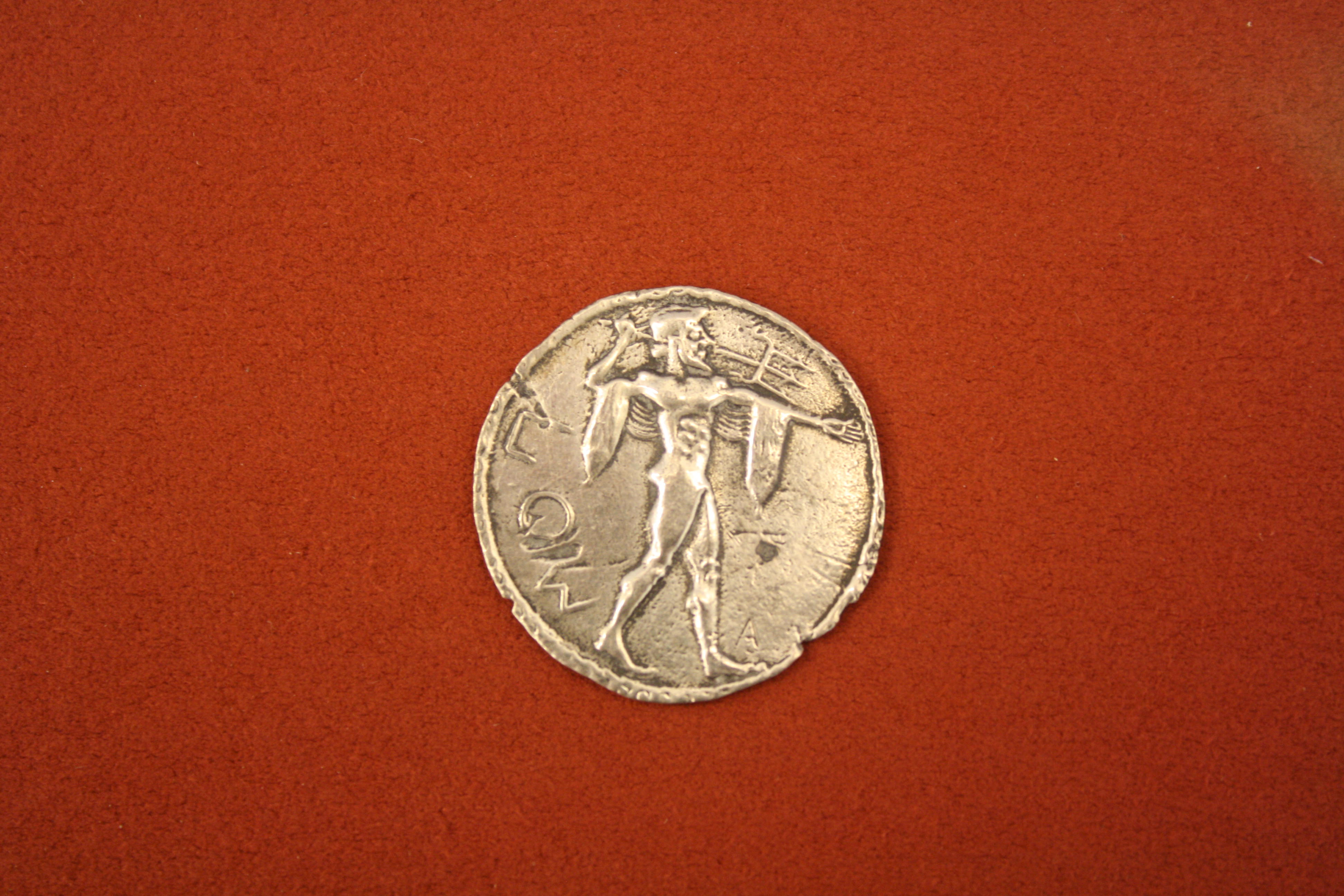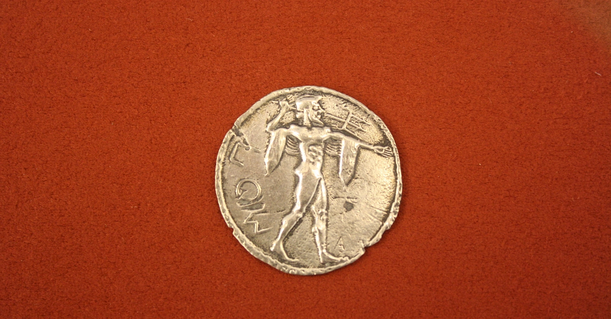 Silver stater from Poseidonia, Lucania, 520 BCE. O: Poseidon with trident. (R: as obverse but incuse).