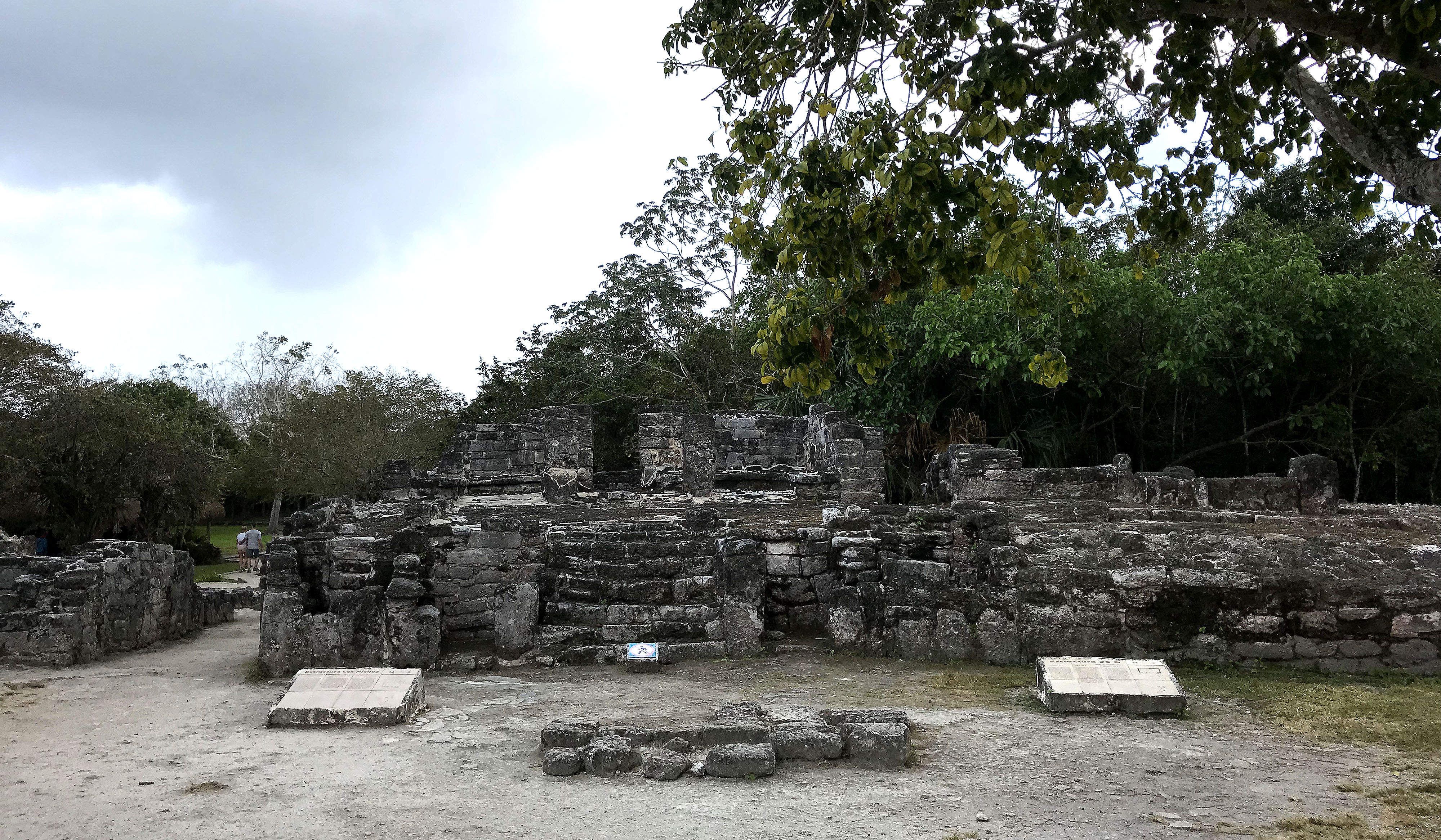 This photograph shows some Maya ruins from the San Gervasio archaeological site, which is located on the island of Cozumel in Mexico. In the center, one sees the "Niches" structure, which was once composed of miniature shrines that were built on the sides of a stairway. The upper part of this structure once had a stone roof, and the interior was predominantly decorated in blue. It was built in the Post Classic Period (c. 1200-1650 CE). On the far right-hand side, one sees the structure "25 B," which was once a colonnaded hall with a masonry roof, supported by wood beams. It differs from other Maya colonnaded halls at San Gervasio in that it has three pillars with square bases and three columns with round bases. This structure was also built during the Post Classic Period (c. 1200-1650 CE).