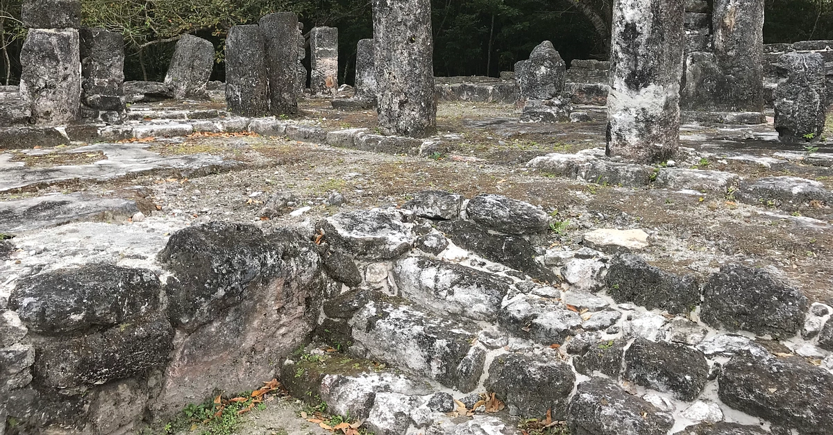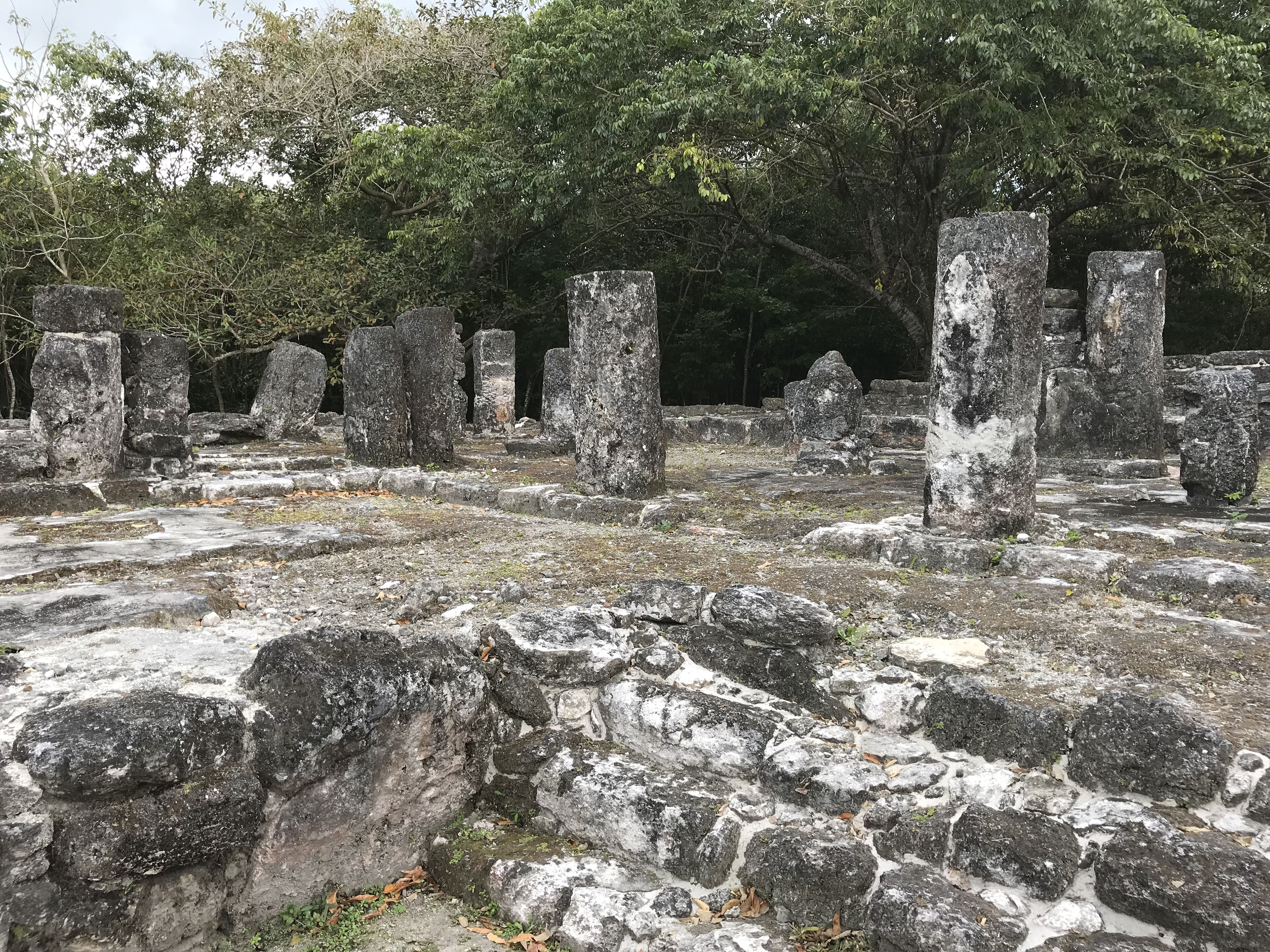 Colonnaded halls were very popular among the Maya along Mexico's eastern coast in Pre-Columbian times. At San Gervasio, located on the Mexican island of Cozumel, one can see this Maya "palace" structure in full-view. This structure has benches along the interior walls and in the middle there was once a throne or an altar. This spot was also perhaps the spot where political leaders presided over meetings with members of the community. This structure has 19 columns. The structure's roof was not vaulted, but rather flat, like modern-day ones, which were constructed with wooded beams. It dates from the Post Classic Period (c. 1200-1650 CE).