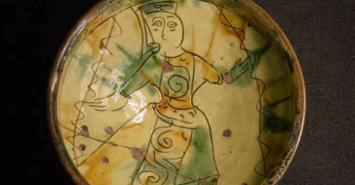 This bowl, dating to the 14th-15th century CE, features a stylized figure of a woman. It is glazed on the inside, and partially on the outside. Made in Cyprus. Discovered in Cyprus. Measures 6.4 cm in height and 16.3 cm in diameter. (British Museum, London)