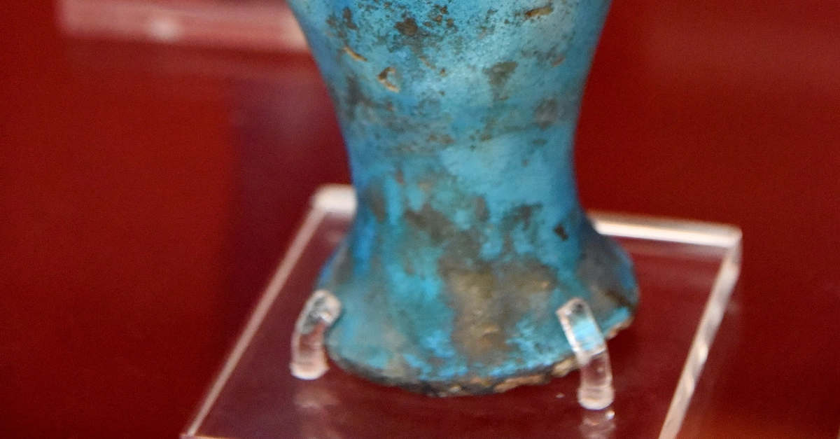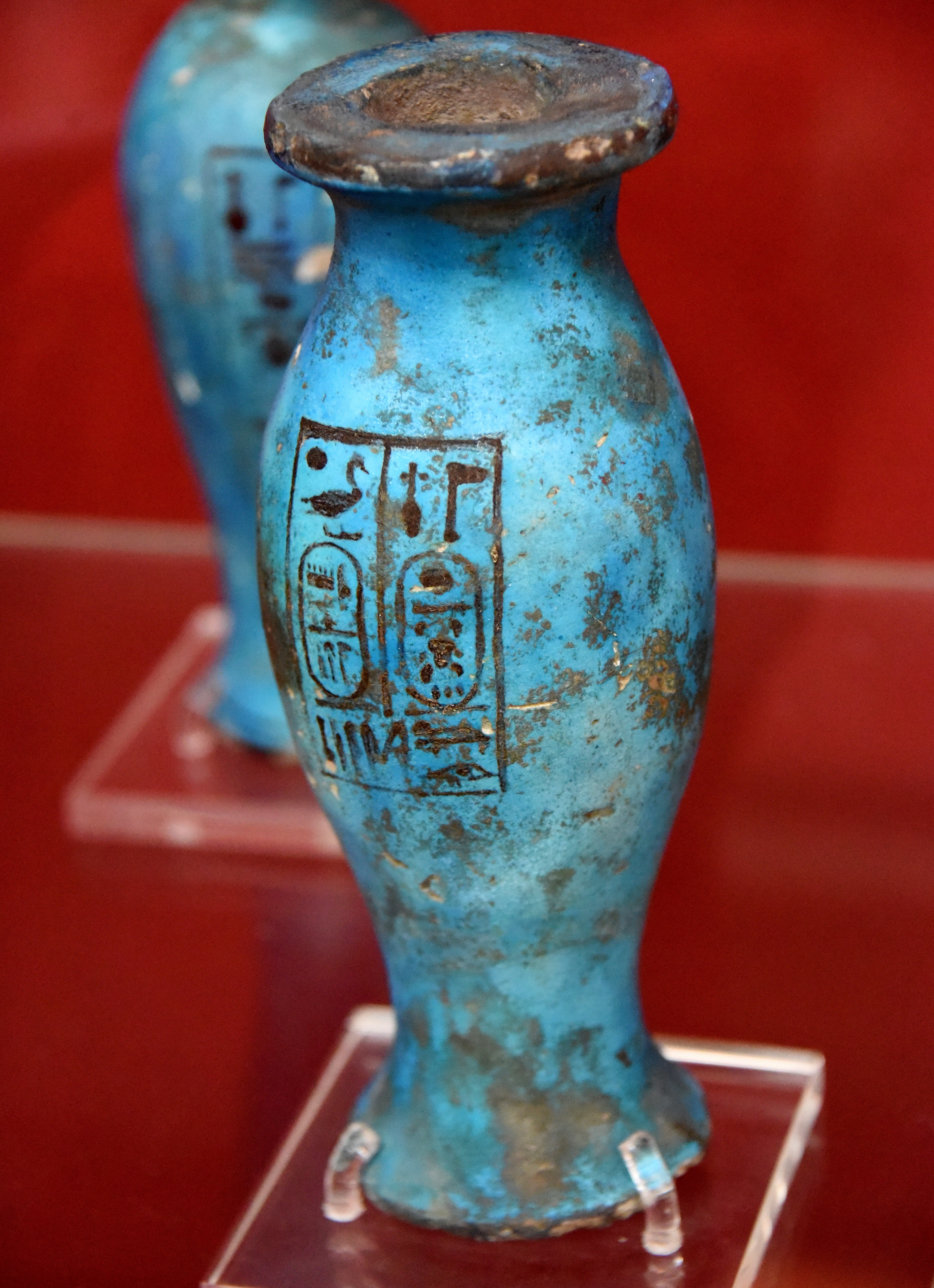This faience vase was inscribed with cartouches of the birth (nomen) and throne (prenomen) names of the Egyptian pharaoh Amenhotep II. New Kingdom, 18th Dynasty, reign of Amenhotep II, 1427-1400 BCE. Probably from the Valley of the Kings, modern-day Egypt. (The British Museum, London).