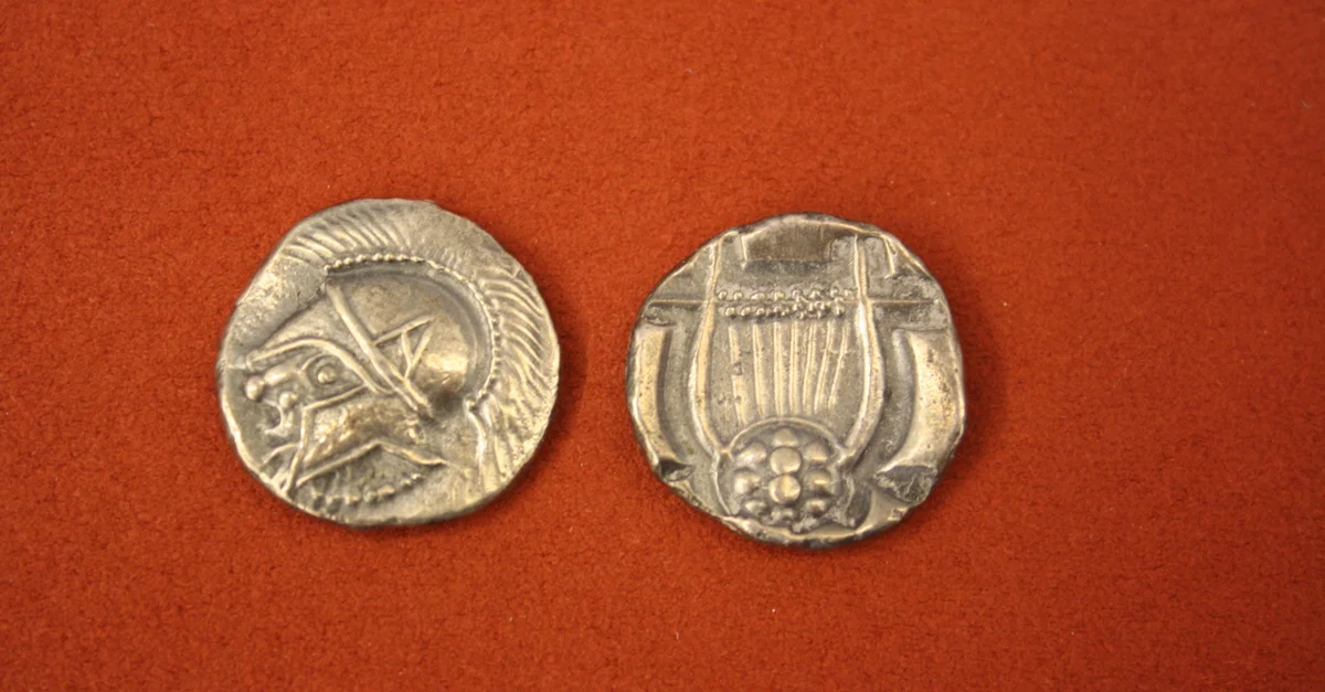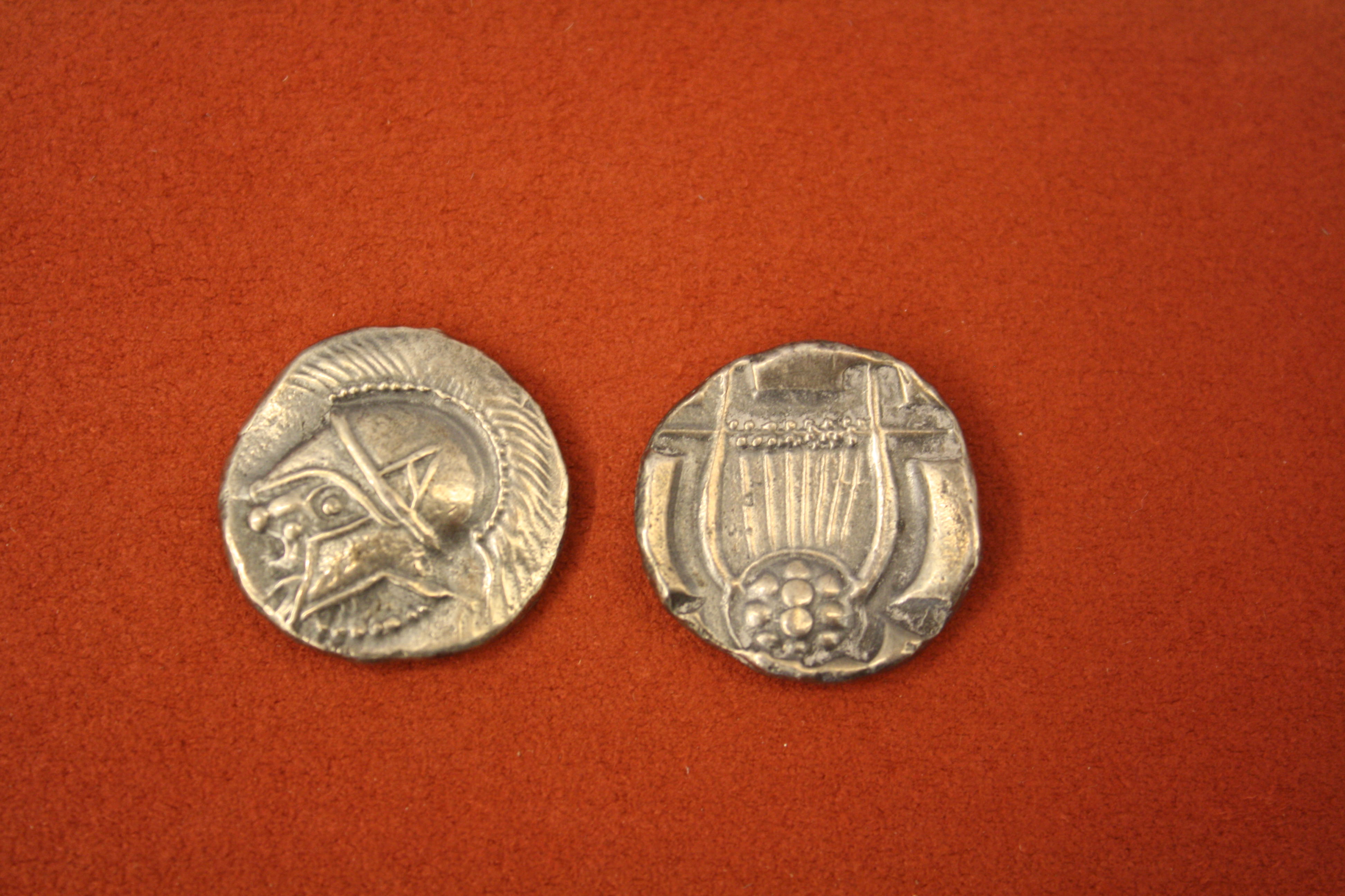 Silver stater from Calymna, Caria, 600-550 BCE. O: Male head in crested helmet. R: Lyre in incuse square.