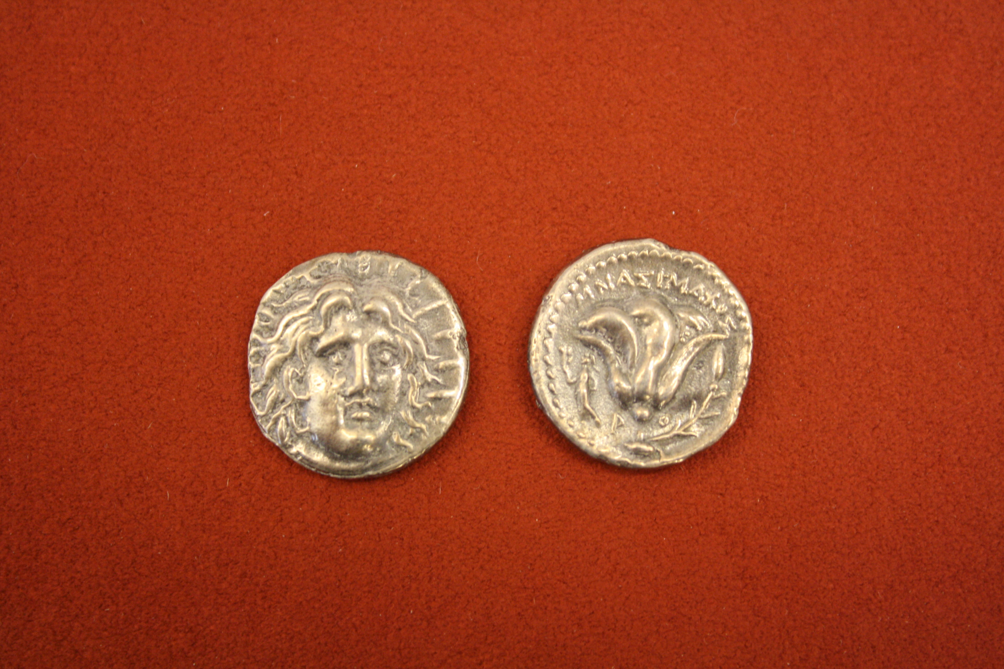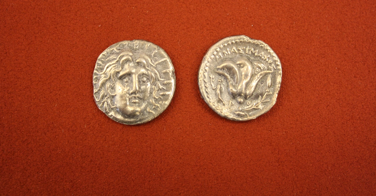 Silver didrachm from Rhodes, Caria, 304-166 BCE. O: Head of Helios. R: Rose.