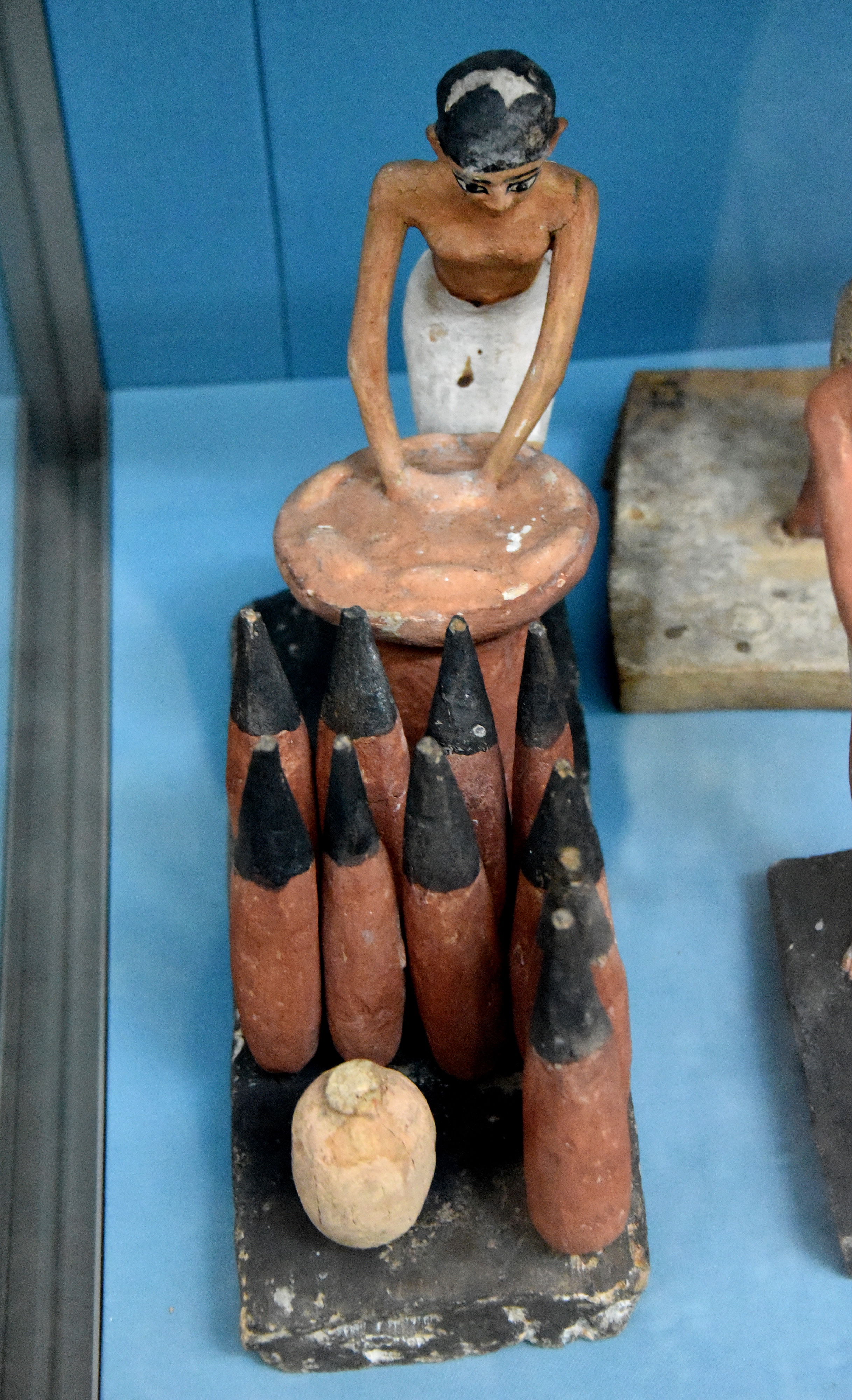 This painted wooden model depicts a woman straining mash. There are eleven jars of beer in front of her. Old Kingdom, 6th Dynasty, 2345-2181 BCE. From tomb 45 at Asyut, modern-day Egypt. (The British Museum, London).