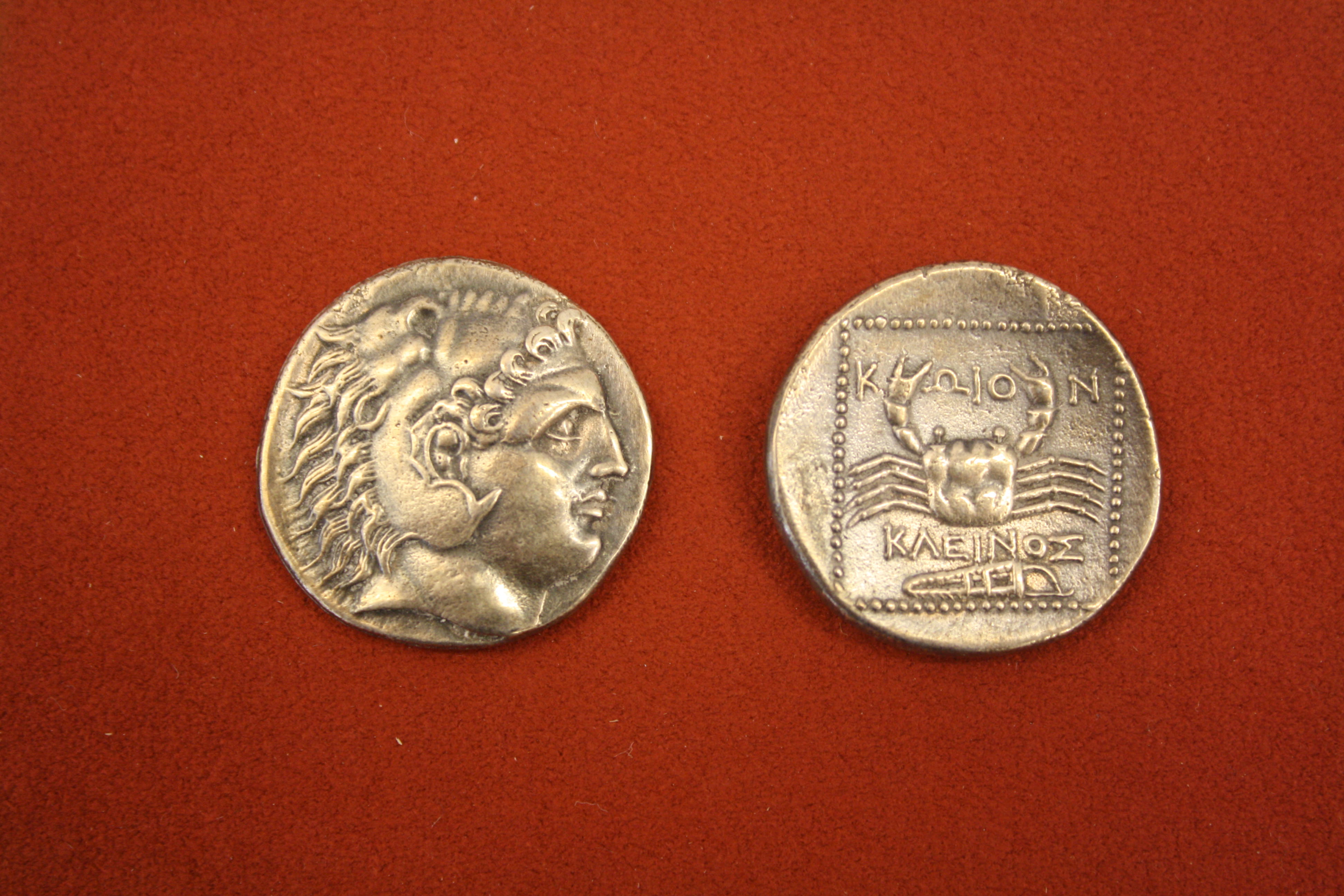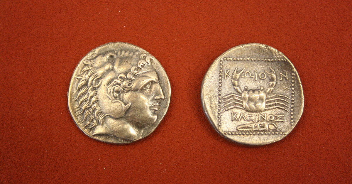 Silver tetradrachm from Cos, Caria, 300-190 BCE. O: Head of Hercules. R: Crab