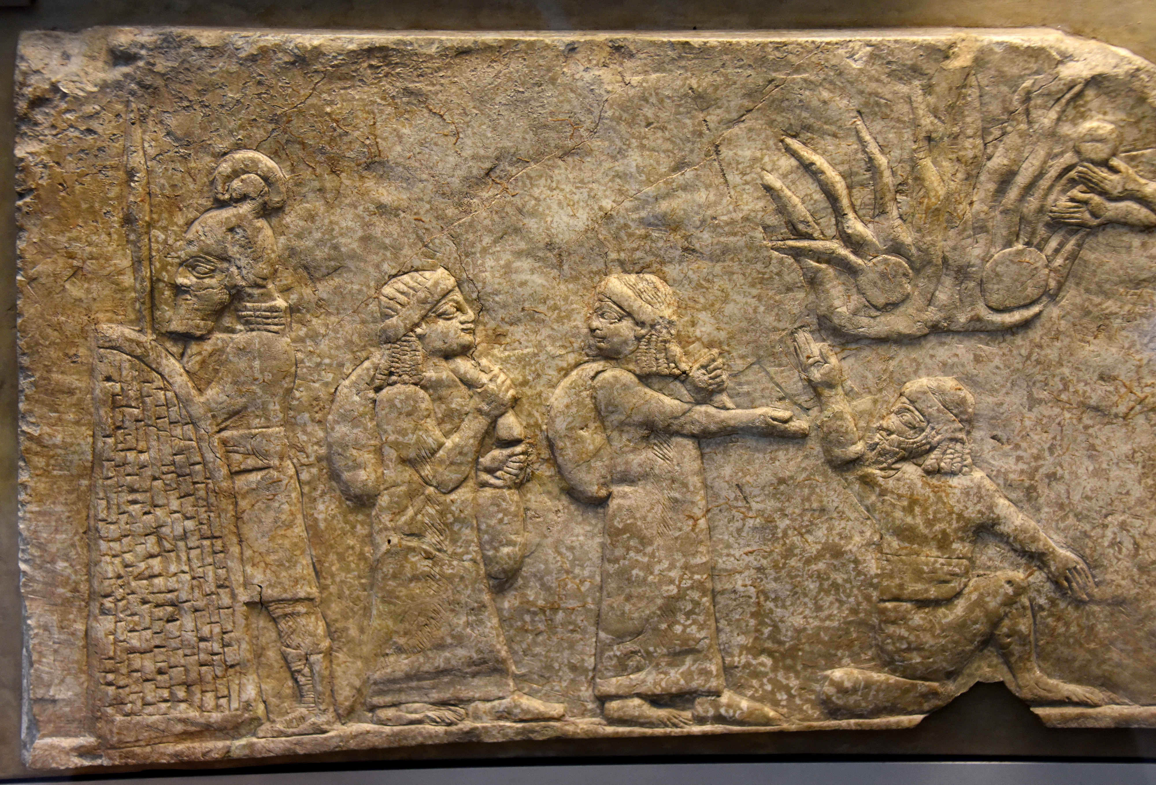 To the left, an Assyrian soldier stands and guards. Two standing women hold bundles. To the right, a man sits and raises his right arm, looking at the women. At the top right, the hands of a man tending the fire are seen.