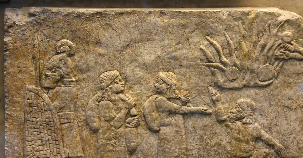 Assyrian alabaster panel showing Babylonian prisoners in a camp, from the North Palace at Nineveh, Northern Mesopotamia, modern-day Iraq, Neo-Assyrian Empire, reign of Ashurbanipal II, 668-630 BCE.