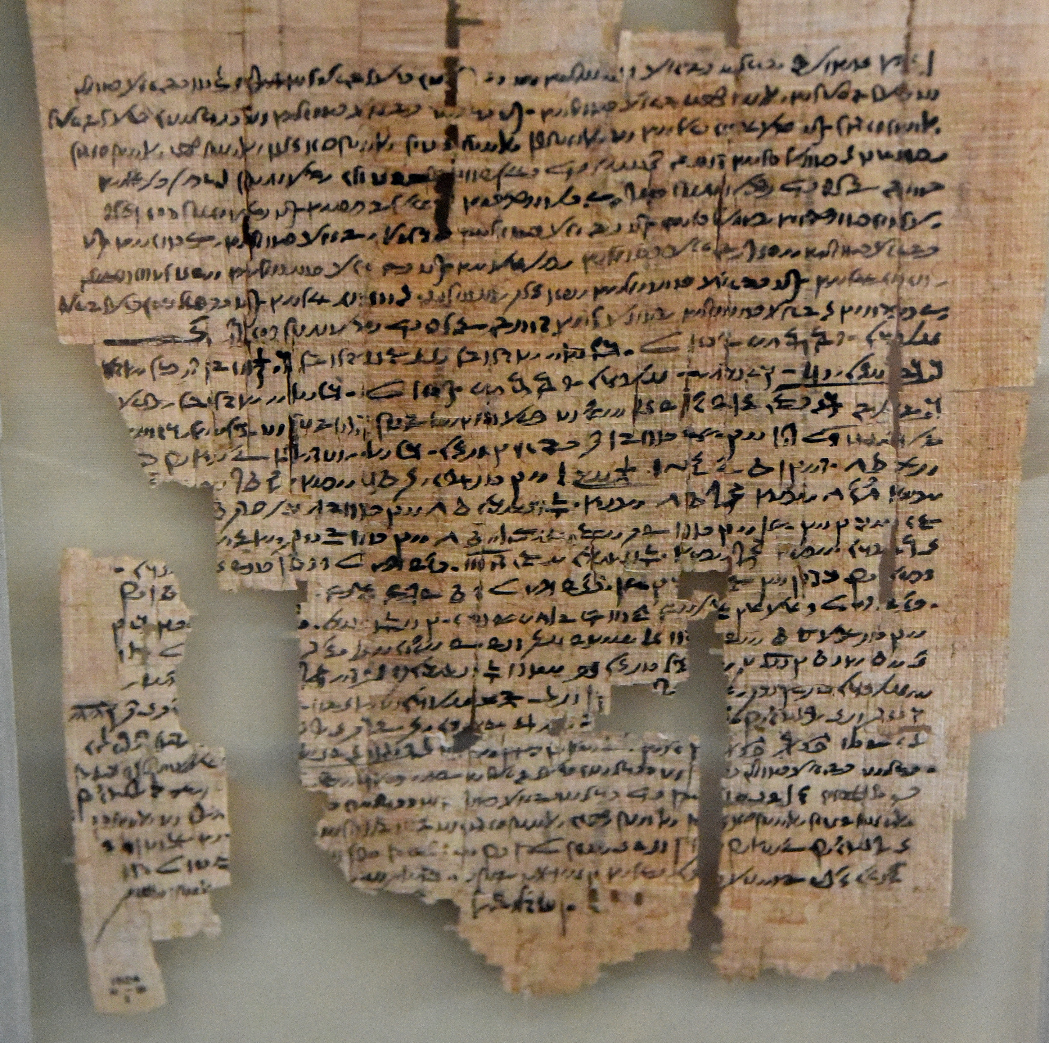 This document contains an agreement between one group of lector-priests of the necropolis of To-ankh at Asyut, and another group, defining which persons were to be employed in the ceremonies of mummification, and what materials were to be provided for every corpse brought to the necropolis. Notable days in the mummification process are specifically mentioned; these include the 4th day, the 16th day, and the 35th day, on which wrapping of the body probably began. Demotic script on papyrus. Ptolemaic Period, reign of Ptolemy VI, 157 BCE. From Asyut, modern-day Egypt. (The British Museum, London).