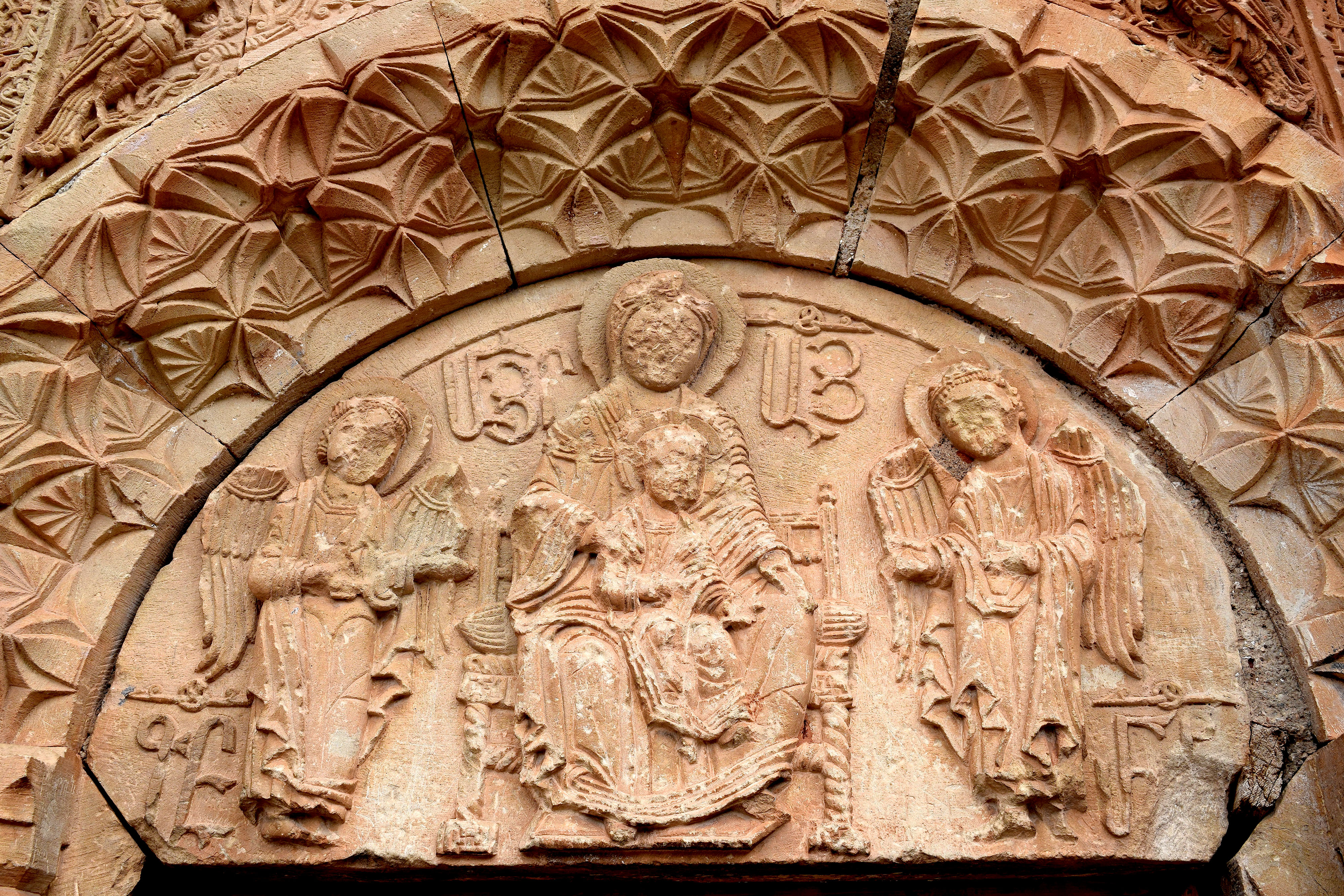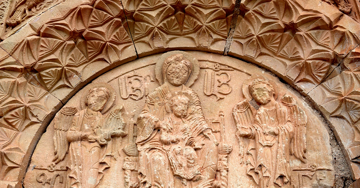 Detail of the Holy Family and archangels from the carved façade of the Surb Astvatsatsin Church at Noravank Monastery in modern Armenia.