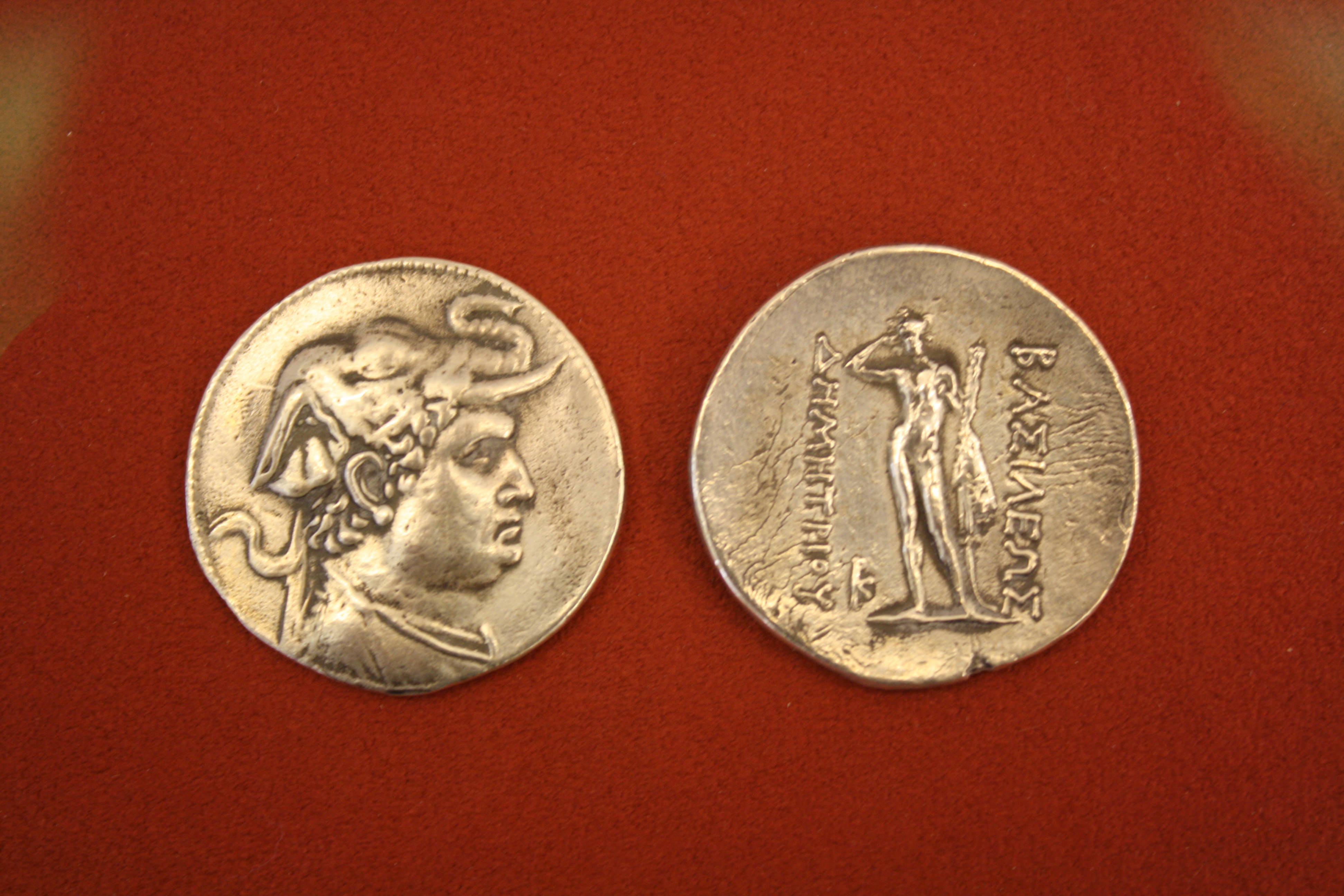 Silver tetradrachm from Bactria, reign of Demetrius I, 205-171 BCE. O: Head of Demetrius I. R: Hercules.