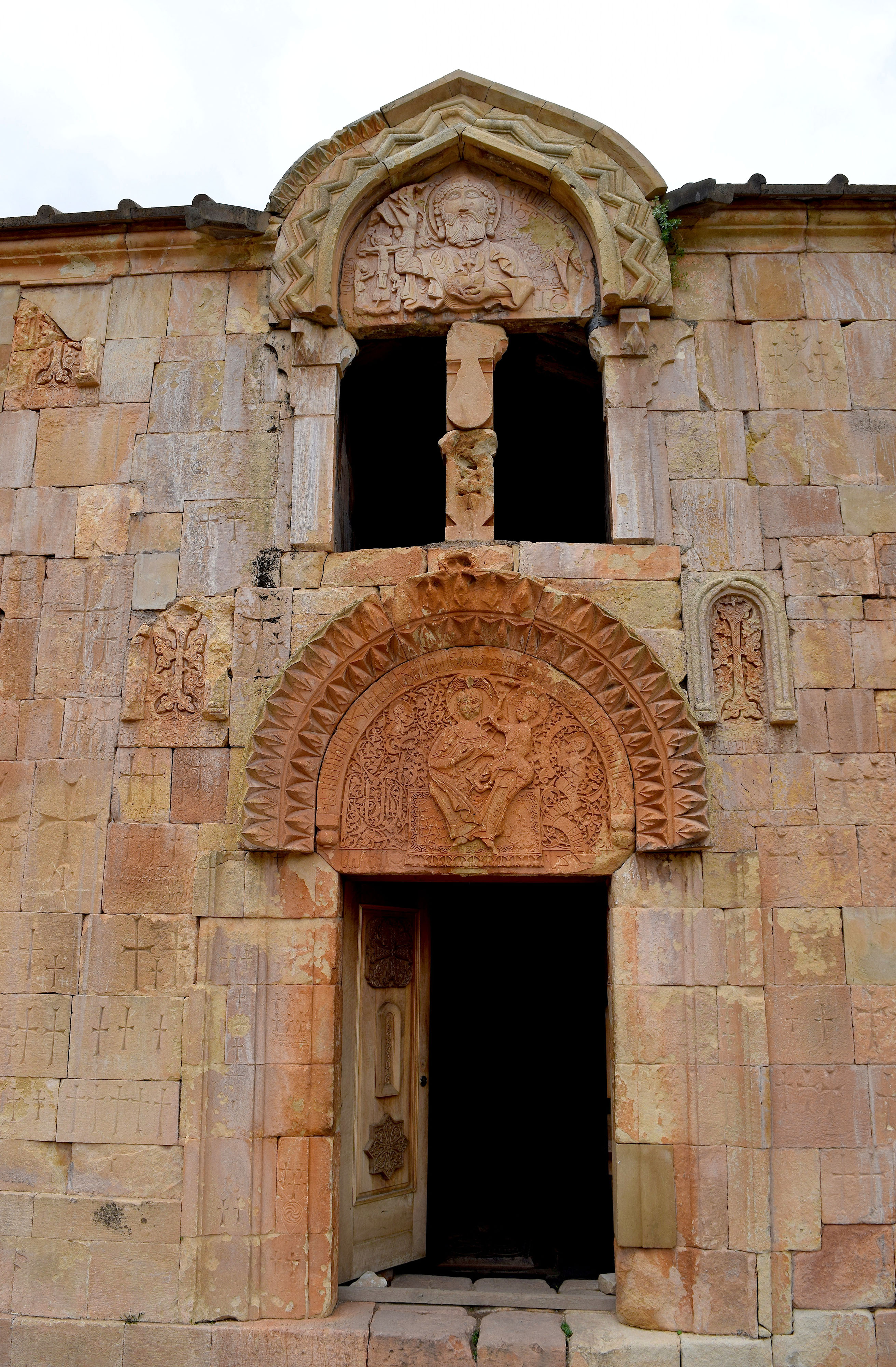 This is the façade of the Surb Karapet Church Church at Noravank Monastery, which is located in present-day Armenia. It was built in the 13th century CE, but it was destroyed repeatedly by earthquakes over the ensuing centuries. It was fully restored in the 20th century CE.