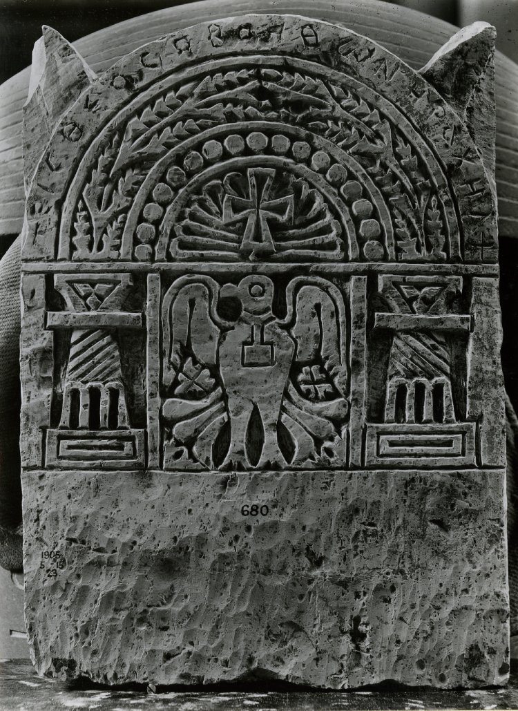 Found in Egypt, this limestone funerary stela, dating to 6th or 7th century CE, depicting a cross above a dove. The Greek inscription reads, "Single God, helping Rachel". Measures 57.4 cm in height, 42.5 cm in width.