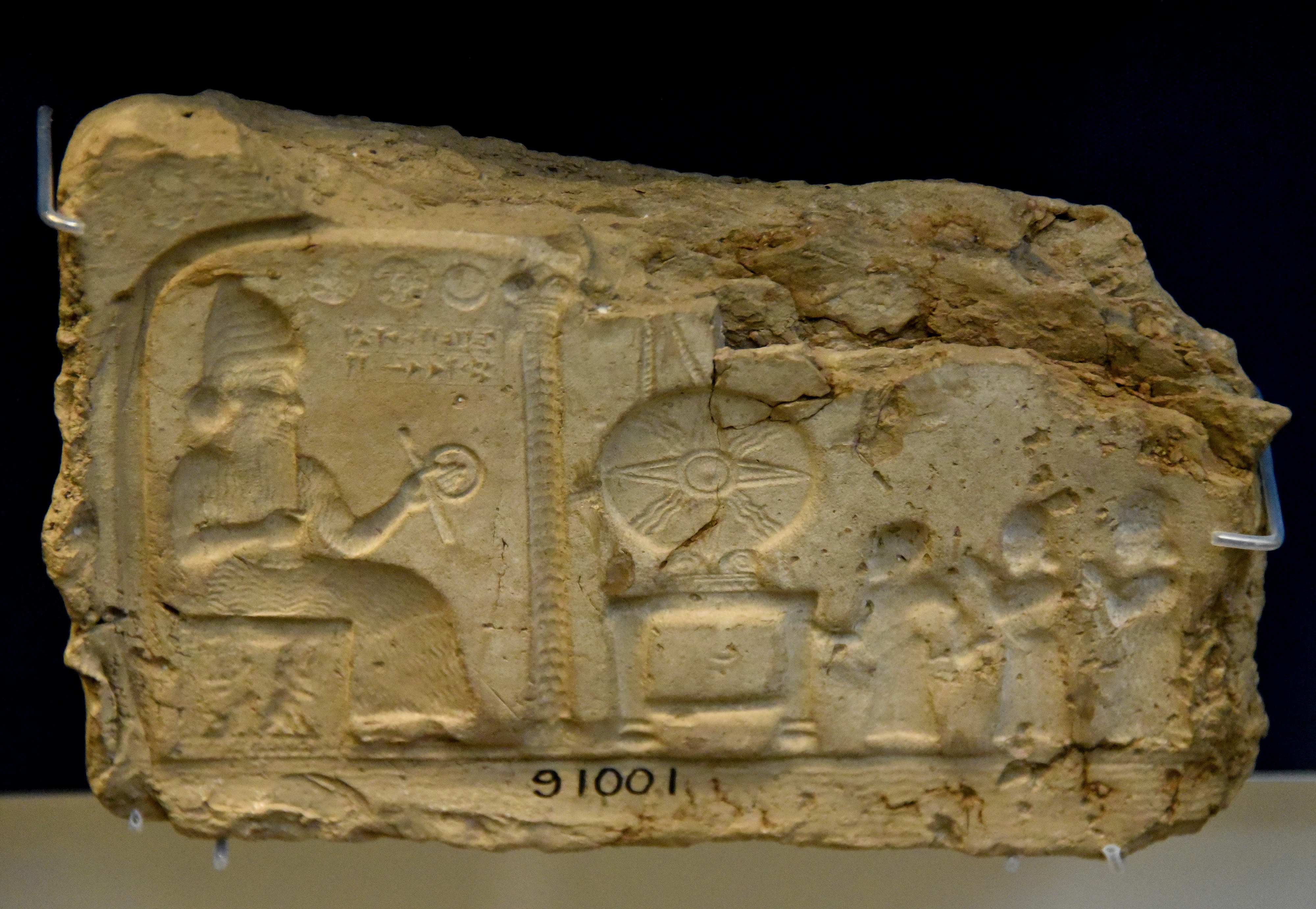 This is a fired clay cover of the sun god (Shamash) tablet. Its purpose was to protect the obverse side (face) of the tablet. It has retained the impression of the carved panel of the tablet. The Babylonian king Nabu-apla-iddina (reigned 888-855 BCE) made this cover and the tablet was buried. The Babylonian king Nabopolassar (reigned 626-605 BCE) found the tablet, and in order to open the tablet, this cover had to be broken. The latter cover, however, was replaced with a new one (to cover the face of the tablet) while this broken one was retained. Both covers were placed in a single coffer and then buried. Circa 860-850 BCE. From the Temple of Shamash at Sippar, Southern Mesopotamia, modern-day Iraq. (The British Museum, London).