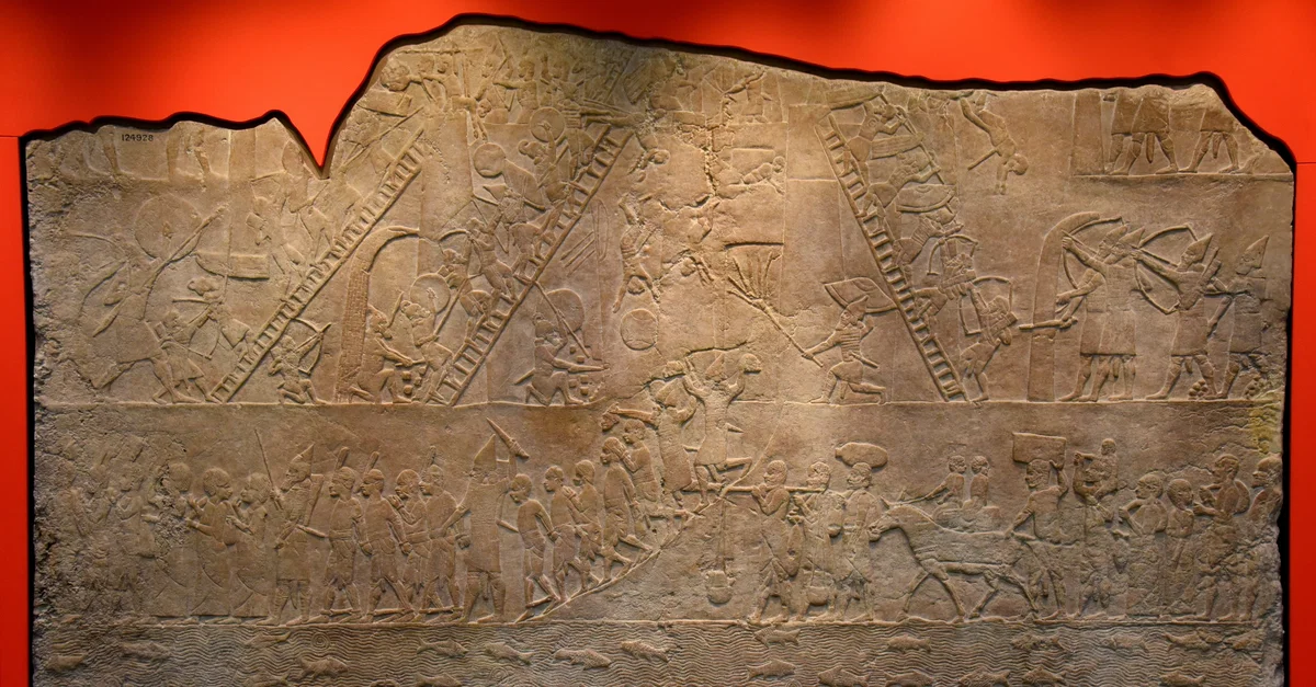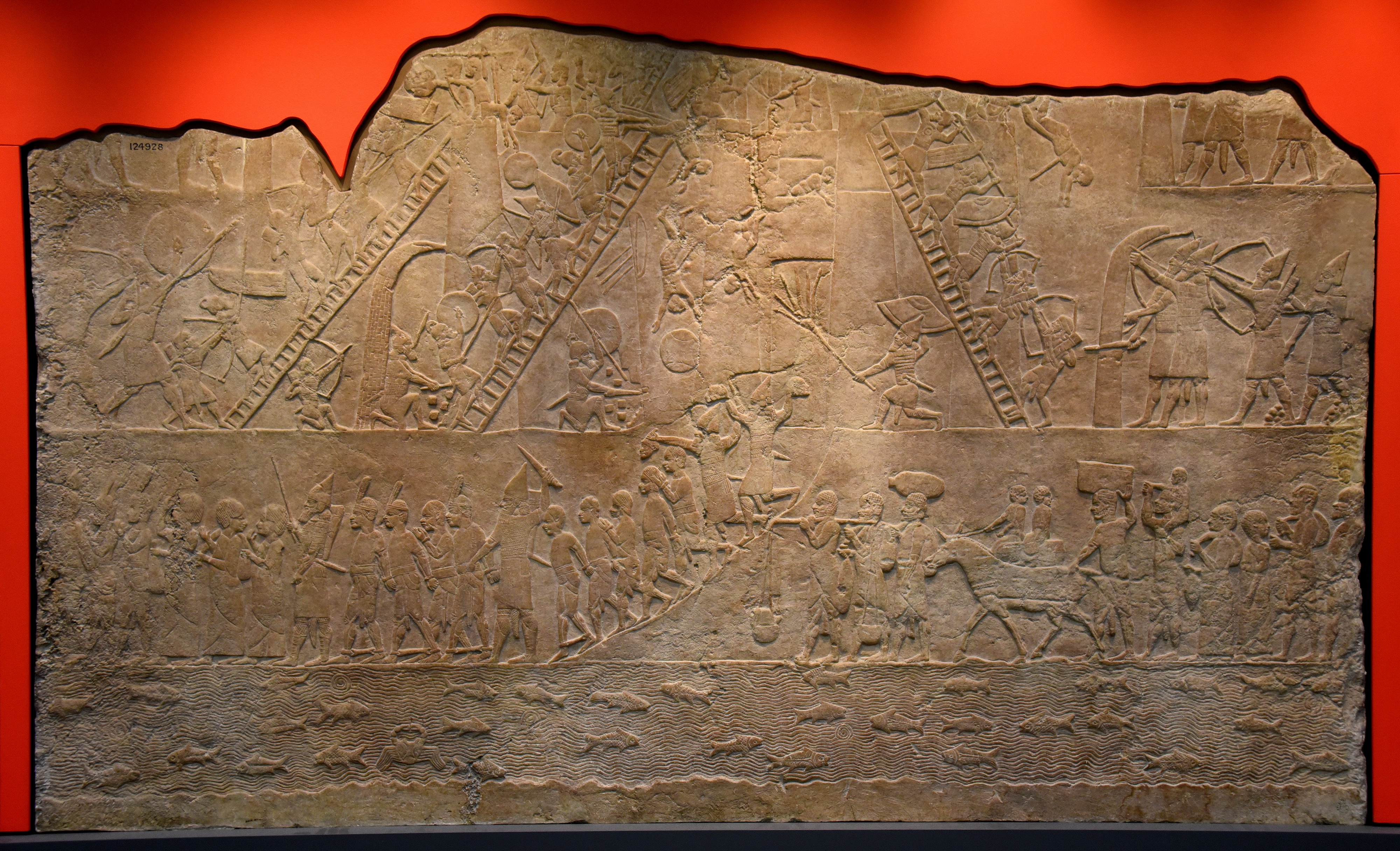 Gypsum panel showing the Assyrian army attacking the Egyptian city of Memphis and commemorating the final victory of the Assyrian king Ashurbanipal II over the Egyptian king Taharqa in 667 BCE. Panel 17, Room M of the North Palace at Nineveh, Northern Mesopotamia, modern-day Iraq, Neo-Assyrian Period, 645-635 BCE.