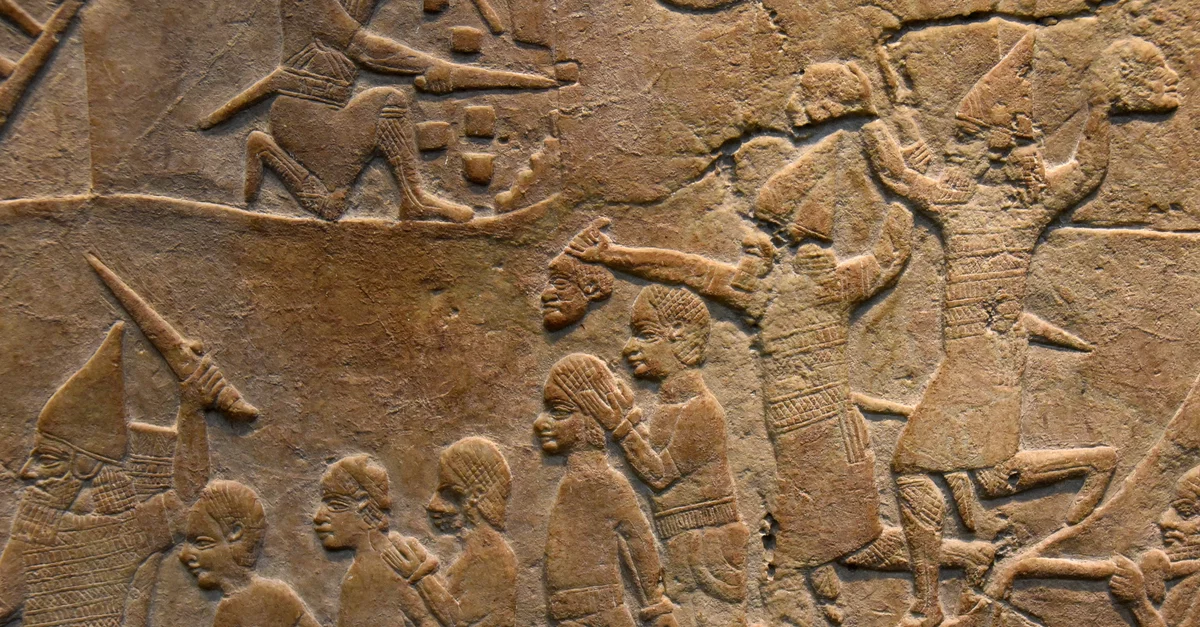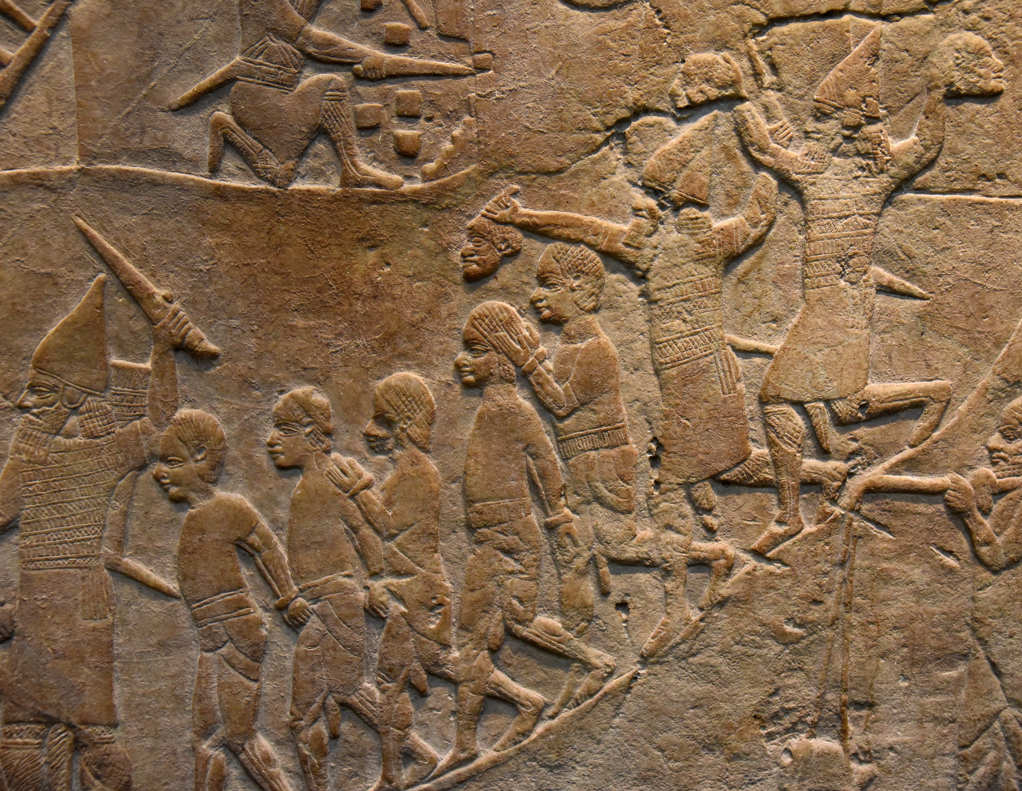 Detail of a large gypsum wall panel, depicting the Assyrian attack on a fortress at the Egyptian city of Memphis in 667 BCE, Panel 17, Room M of the North Palace at Nineveh, Northern Mesopotamia, modern-day Iraq, Neo-Assyrian Empire, 645-635 BCE.