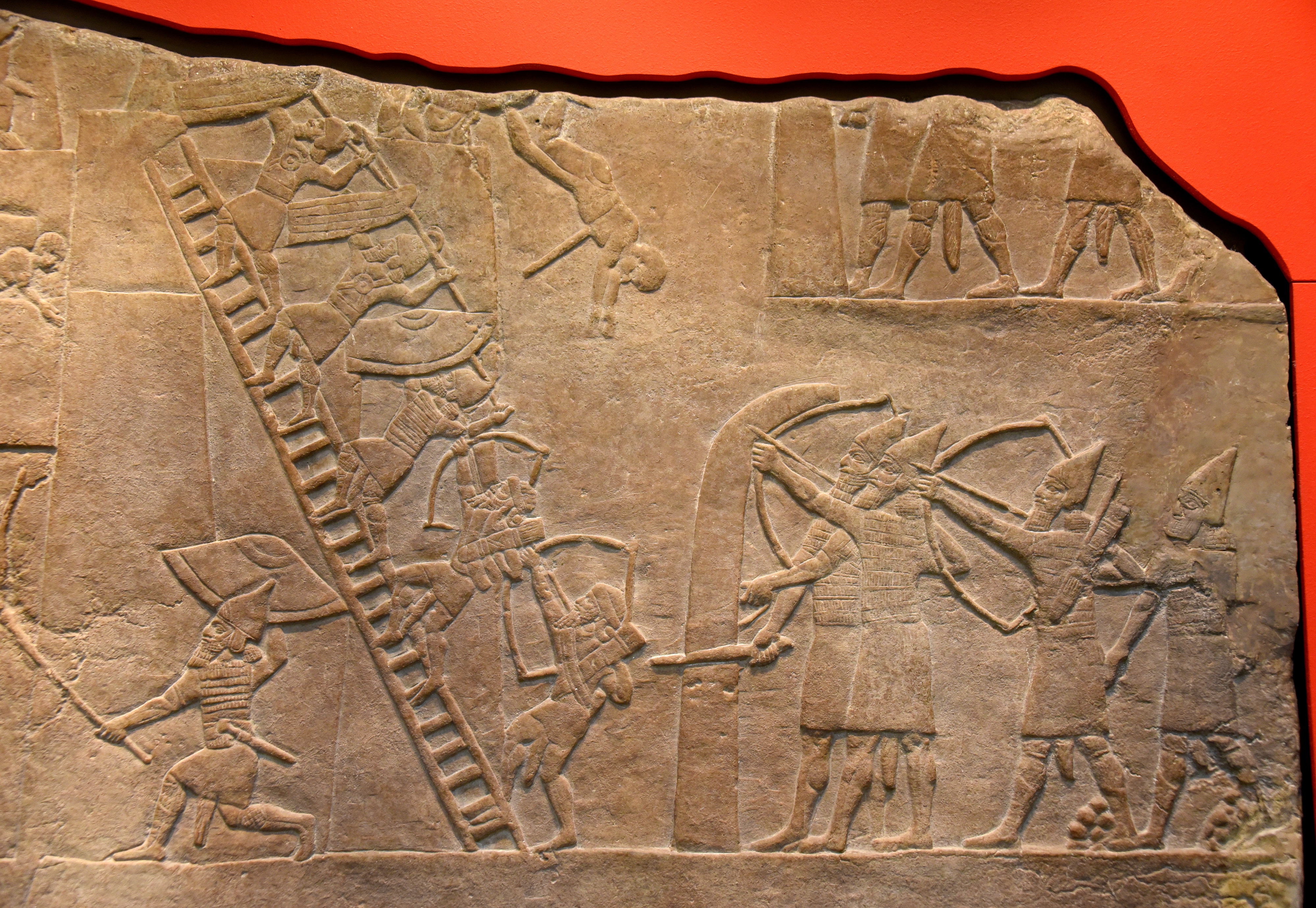 On the right, an Assyrian soldier holds a large shield protecting archers aiming at the fortress. Part of a similar group appears above. On the left, an Assyrian soldier sets fire to the gate. A long ladder leans on the fortress, on which Assyrian spearmen and archers ascend. A Nubian soldier falls from a tower.