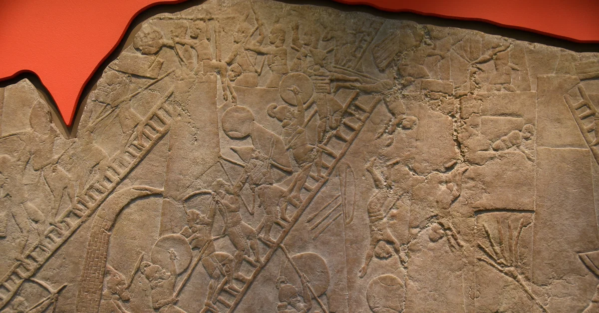 Detail of a large gypsum wall panel showing the Assyrian army attacking the Egyptian city of Memphis and commemorating the final victory of the Assyrian king Ashurbanipal II over the Egyptian king Taharqa in 667 BCE. Panel 17, Room M of the North Palace at Nineveh, Northern Mesopotamia, modern-day Iraq.
