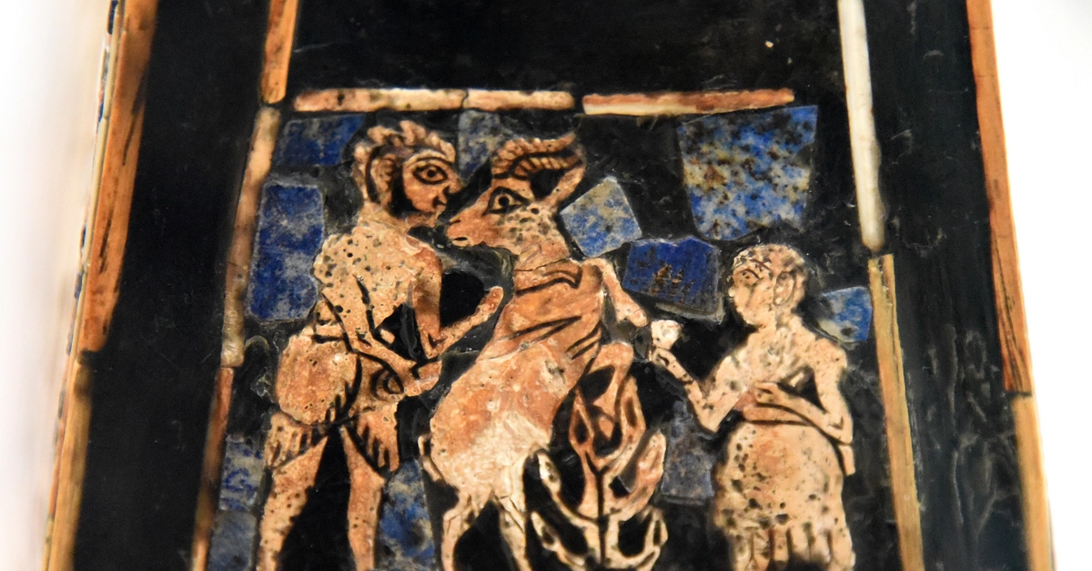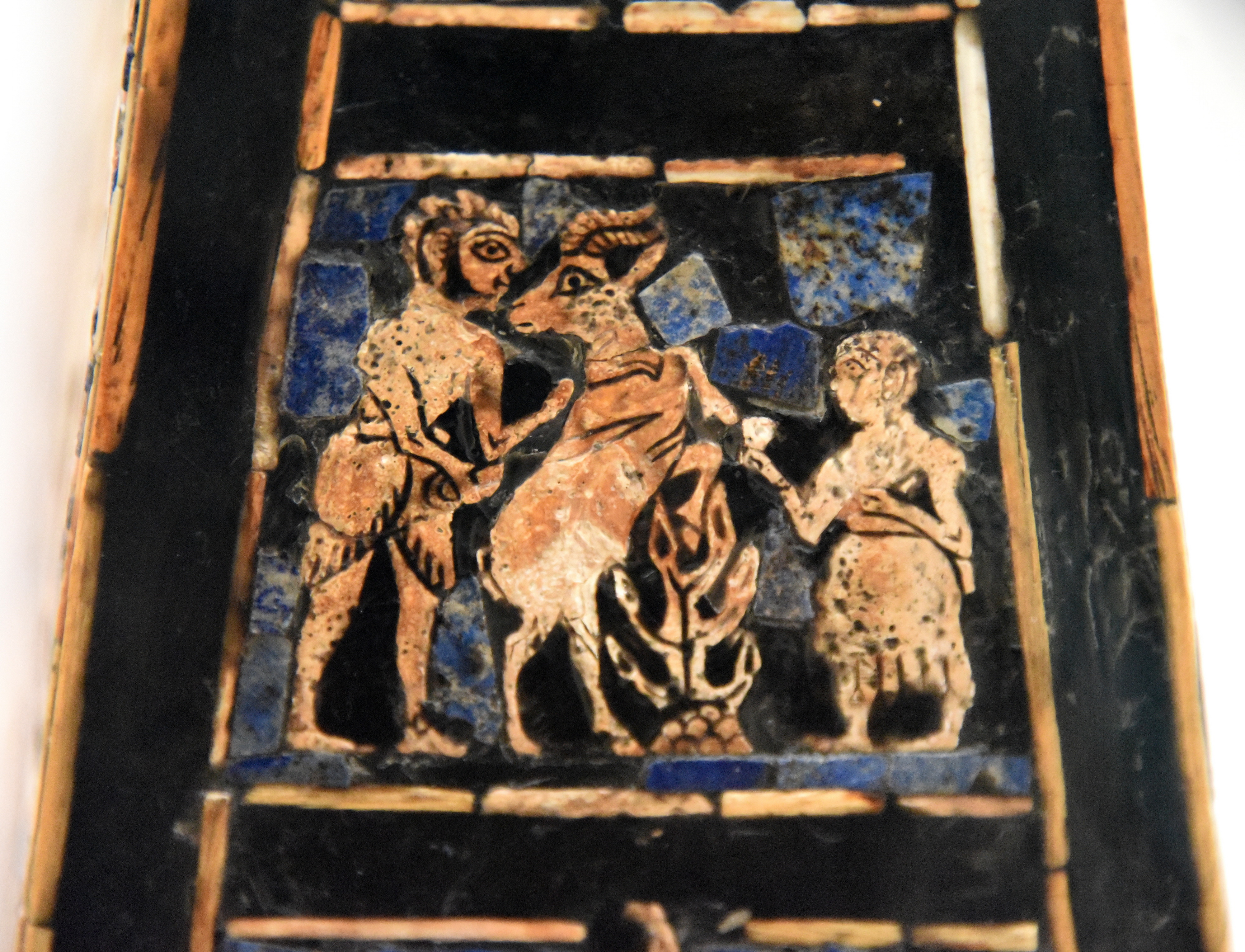 This is one of the scenes depicted on one of the sides of the Standard of Ur; this is not part of the so-called "Peace and War Scenes" of the Standard. Here, a rearing goat at a small tree or a shrub is flanked by two men. The man on the right is shorter than his counterpart, wears a flounced skirt, and holds a cup in his right hand. The man on the left wears a different skirt and faces the goat; he does not hold anything. The overall depiction of the goat is very similar to the so-called "Ram in a Thicket" statue, which was found at the Great Death Pit of the Royal Cemetry of Ur. The Standard of Ur is a (reconstructed) hollow box and its precise purpose is unknown. Shell, lapis lazuli, and bitumen; the wood is a modern one as the original wood had disintegrated. Early Dynastic Period, circa 2500 BCE. From the Royal Cemetry of Ur, Ur, Sothern Mesopotamia, modern-day Iraq. (The British Museum, London).