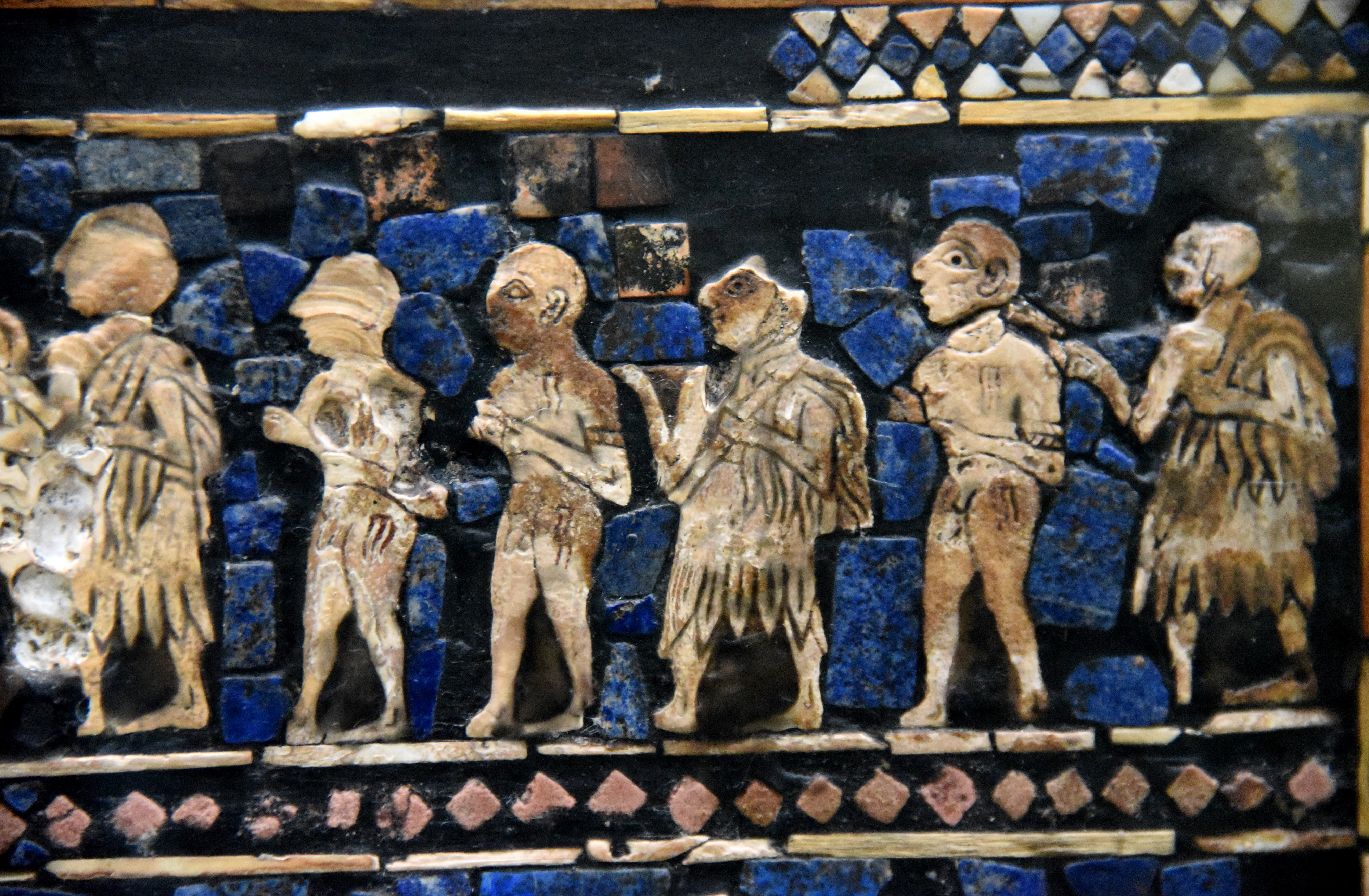 This is a detail of the so-called "War Scene" of the Standard of Ur. This detail is the right end of the top register. Sumerian soldiers wearing flounced skirts lead prisoners of wars. The captives are naked and their bodies have wounds with blood gushing from them. The soldier on the right holds a band, with his right hand, wrapped around the neck of the prisoner in front of him. The artist was successful in delivering the scene of humiliation and defeat of the captives. The depictions, in mosaic, were made using lapis lazuli, red limestone, and shell set in place with bitumen. The Standard of Ur is a (reconstructed) hollow box and its precise purpose is unknown. Early Dynastic Period, circa 2500 BCE. From the Royal Cemetry of Ur, Ur, Sothern Mesopotamia, modern-day Iraq. (The British Museum, London).