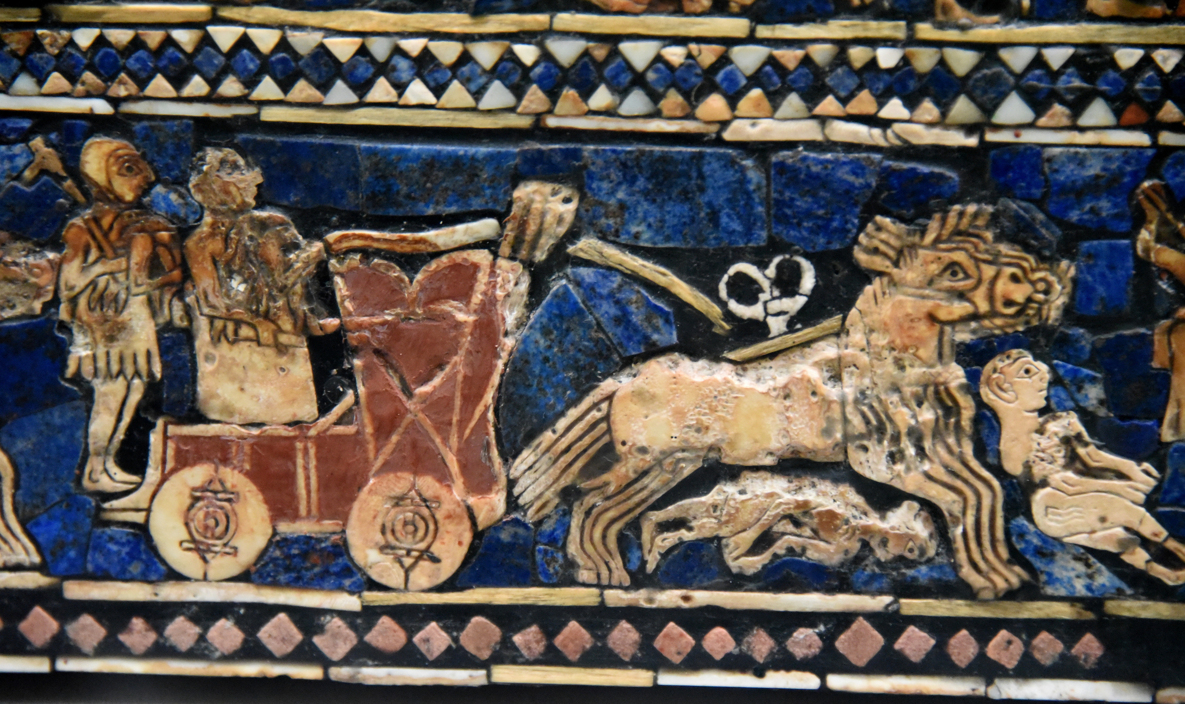 This is a detail of the so-called "War Scene" of the Standard of Ur from the right half of the bottom register. Here, a four-wheeled chariot is drawn by four galloping equids. The wheels of the chariot are solid and not spoked; around 1800 BCE, spoked wheels were invented. A charioteer drives the chariot and holds the reins. Behind him, another soldier accompanies him, holding an axe. At the front of the chariot, a container for spare spears appears. There are no bits (bits were introduced about 1000 years later). There is a rein post with rings on the back of the equids. These animals were probably onagers or asses; during the second millennium BCE, horses came to Mesopotamia from Central Asia. This example is a perfect one illustrating how Sumerians, 4500 years ago, harnessed equids without bits. There are two trampled and naked enemy soldiers; one below the hooves and one in front of the legs of the equids. The depictions, in mosaic, were made using lapis lazuli, red limestone, and shell set in place with bitumen. The Standard of Ur is a (reconstructed) hollow box and its precise purpose is unknown. Early Dynastic Period, circa 2500 BCE. From the Royal Cemetry of Ur, Ur, Sothern Mesopotamia, modern-day Iraq. (The British Museum, London).