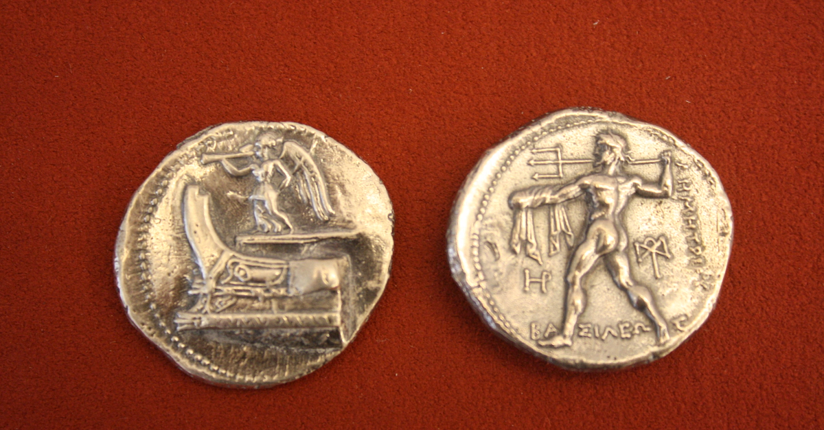 Silver tetradrachm from Macedonia, reign of Demetrius I of Macedon, 306-283 BCE. O: Nike blowing a trumpet on a ship's brow. R: Poseidon with trident. The coin was minted to commemorate Demetrius' victory over Ptolemy I at Salamis near Cyprus in 306 BCE.