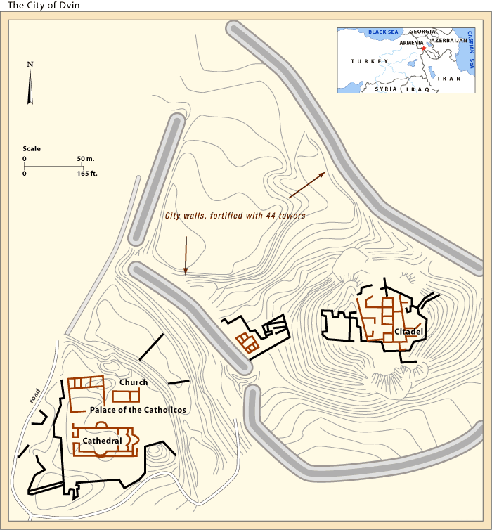 A map of the principal remains of the archaeological site at Dvin, Armenia. Dvin was the capital of Armenia from the 4th to 8th century CE.
