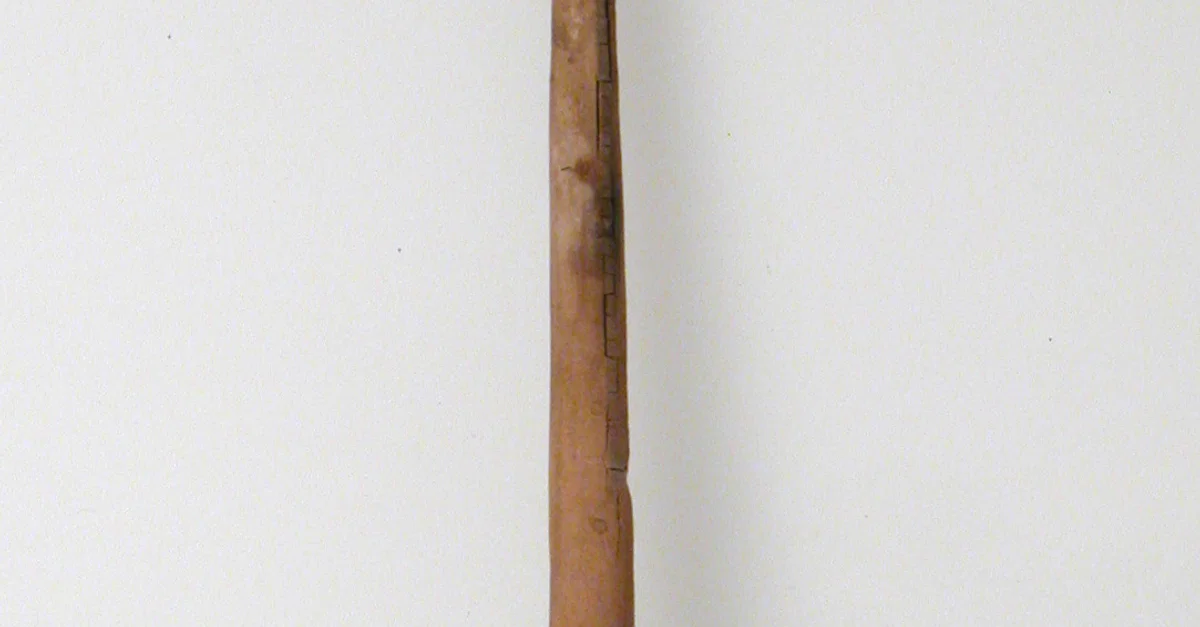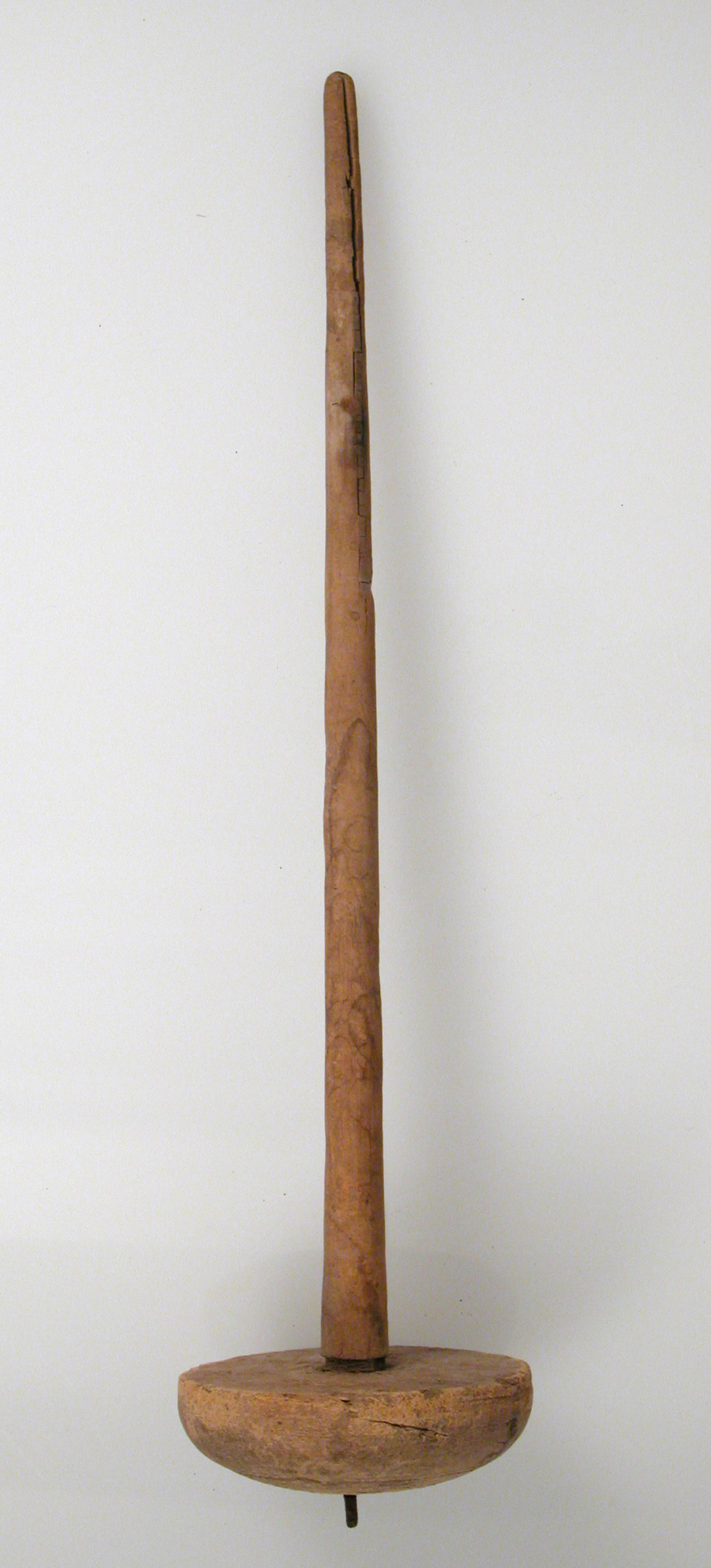 Made in Byzantine Egypt between 580-640 CE, this wood and iron spindle measures 34.2 x 8.1 cm overall, with the whorl measuring 2.7 x 8.1 cm.