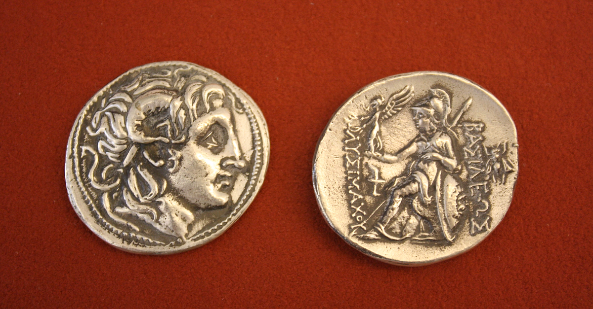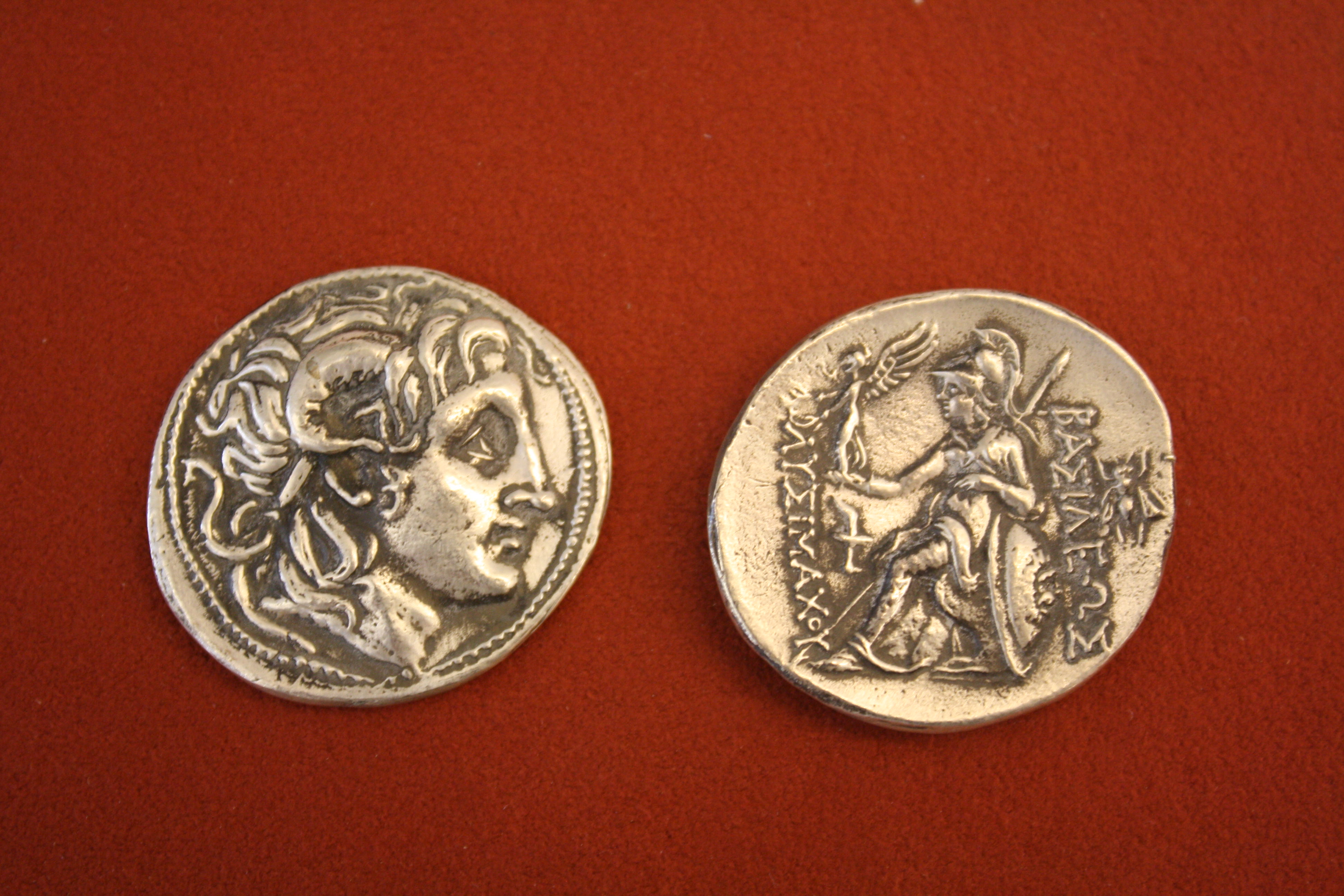Silver tetradrachm from Thrace, reign of Lysimachus, 323-281 BCE. O: Head of Alexander as Ammon-Zeus. R: Athena holding Nike.