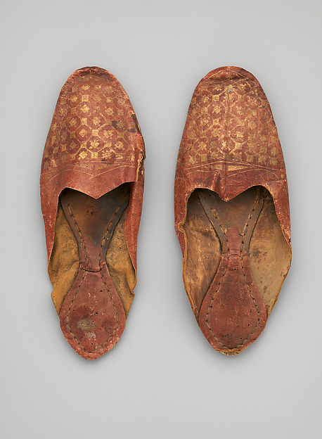 Dating between the 4th-7th centuries CE, these shoes feature gilded leather. Found near Panopolis (now Akhmim, Egypt). They measure 23.5 cm in length (Metropolitan Museum of Art, New York).