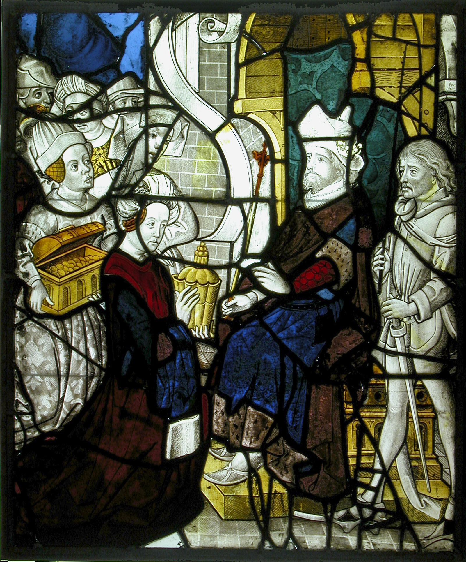 Glass panel with Solomon Receiving the Queen of Sheba. Franco-Netherlandish, 15th–16th century CE. Metropolitan Museum of Art
