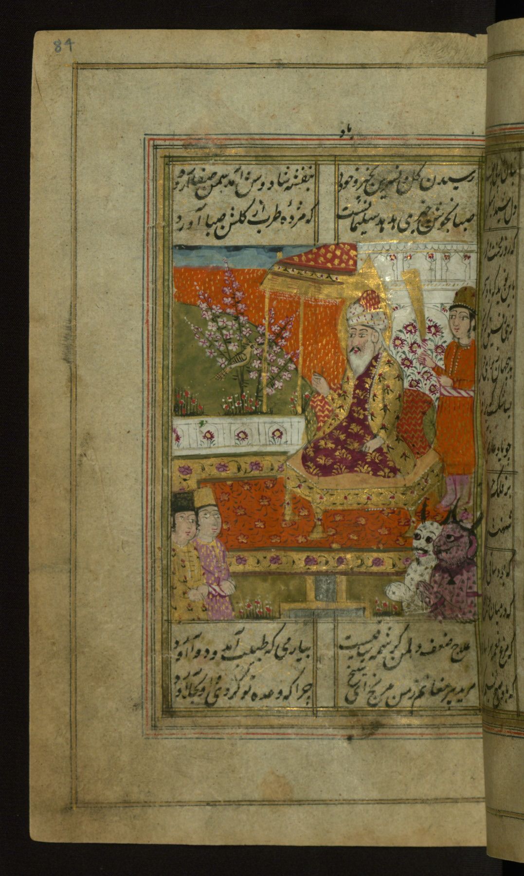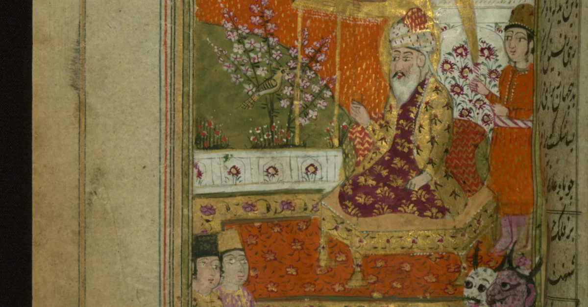 Collection of poems (divan), King Solomon and the hoopoe who brought news from Queen Sheba, Walters Manuscript W.636, fol. 84a An illustrated copy of the collection of poems (Dīvān) by Shams al-Dīn Muḥammad Ḥāfiz al-Shīrāzī who flourished in the 14th century CE. The present codex was copied by Mullā Muḥammad Qāsim Hamadānī in1796 CE in India and contains 48 miniatures.