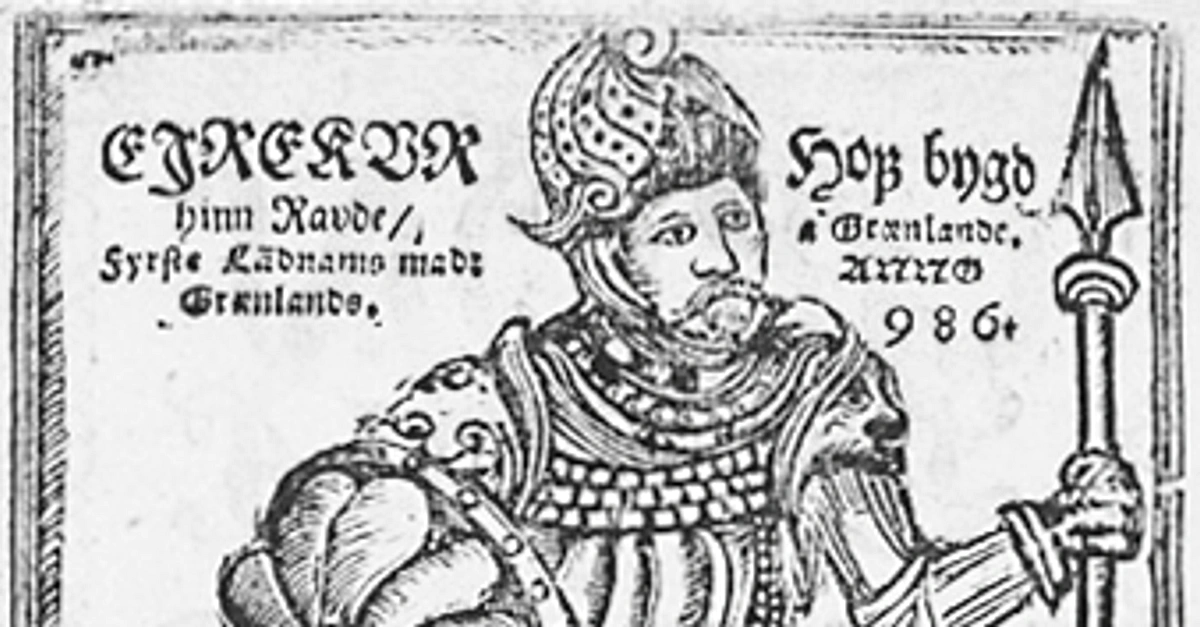 Woodcut frontispiece depicting the Norse Viking Erik the Red, founder of the first Viking settlement in Greenland c. 985 CE, as found in the 1688 CE Icelandic publication of Arngrímur Jónsson's Gronlandia (Greenland). It is presently kept in the Fiske Icelandic Collection.