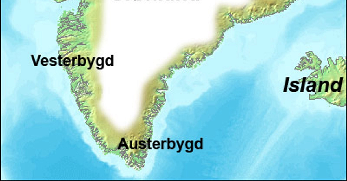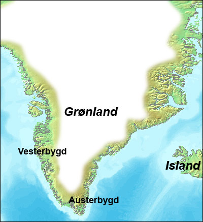 Map depicting the Norse Viking settlements in Greenland. The Eastern Settlement, here named 'Austerbygd' sat on the southwestern tip and was occupied between c. 985-1450 CE, while the Western Settlement (here called 'Vesterbygd', occupied c. 985-1350 CE) was some 600 km further north in the present-day Nuuk region. Disko Bay, the Northern hunting grounds where the Vikings hunted walrus, narwhals, and polar bears, lies roughly in the large inlet directly to the left of the text 'Grønland' (Greenland). 'Island' means Iceland.