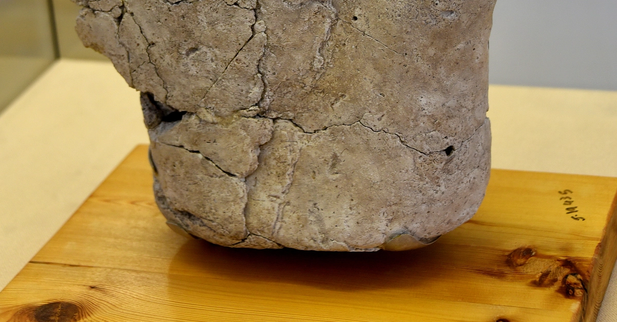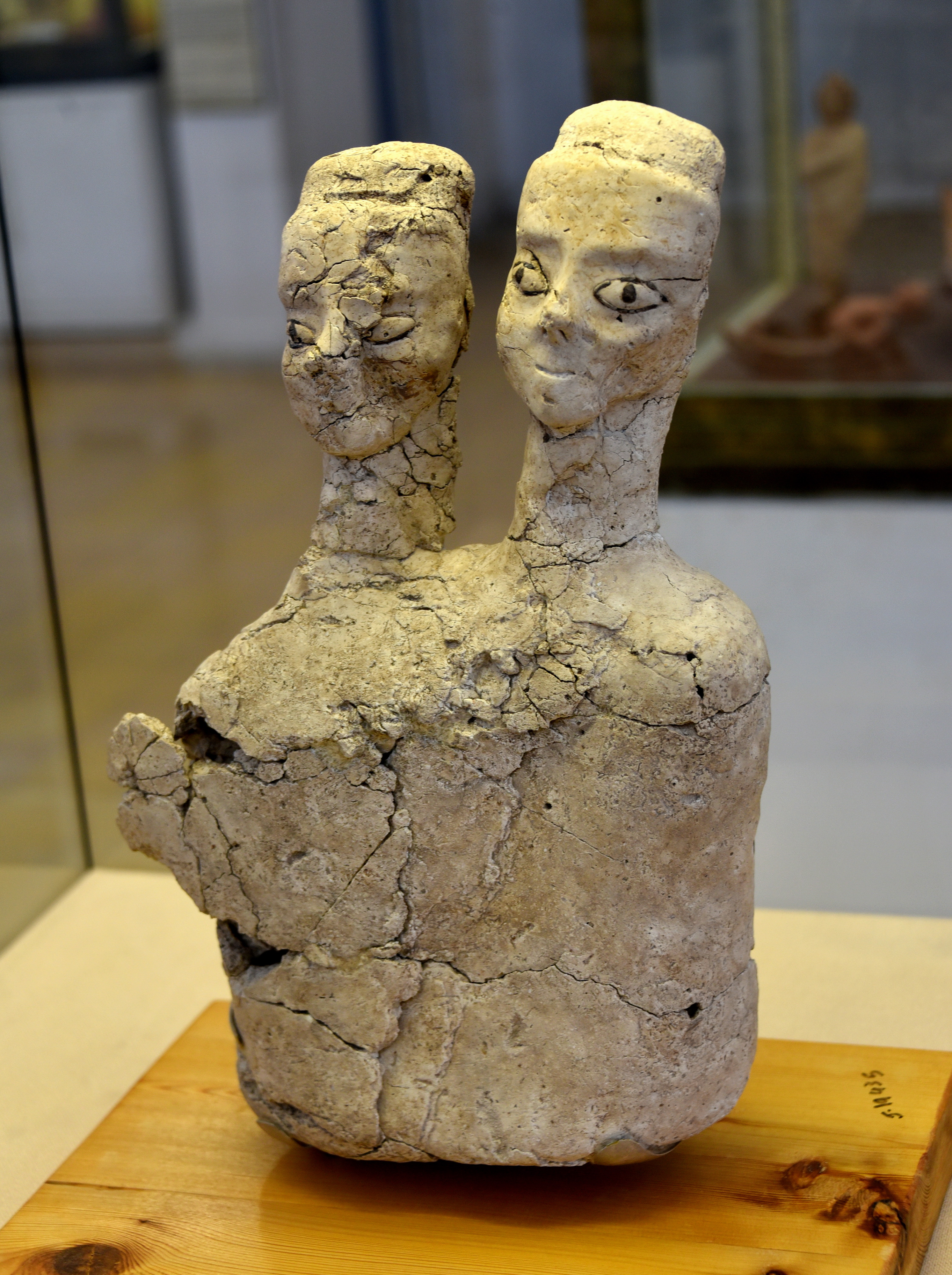 This double-headed statue (upper torso) was made of lime plaster, reed, and bitumen and was found in modern-day Ain Ghazal city in the outskirts of Amman, Jordan Hashemite Kingdom in the year 1985 CE. Between 1983-1985 CE, 15 statues and 15 busts made of lime plaster and reed were found in two underground caches. These statues and busts (depicting human heads) are considered the earliest large-scale representations of the human form and are one of the most outstanding examples of prehistoric art from the Pre-Pottery Neolithic B period. All of them are in Jordan and are on display at the Jordan Archaeological Museum and the Jordan Museum; two are on display (as a loan) at the British Museum in London. Pre-pottery Neolithic period B, circa 6500 BCE. (Jordan Archaeological Museum, Amman, Jordan).
