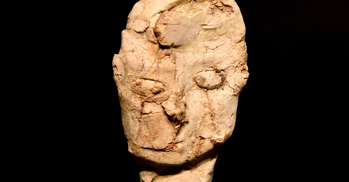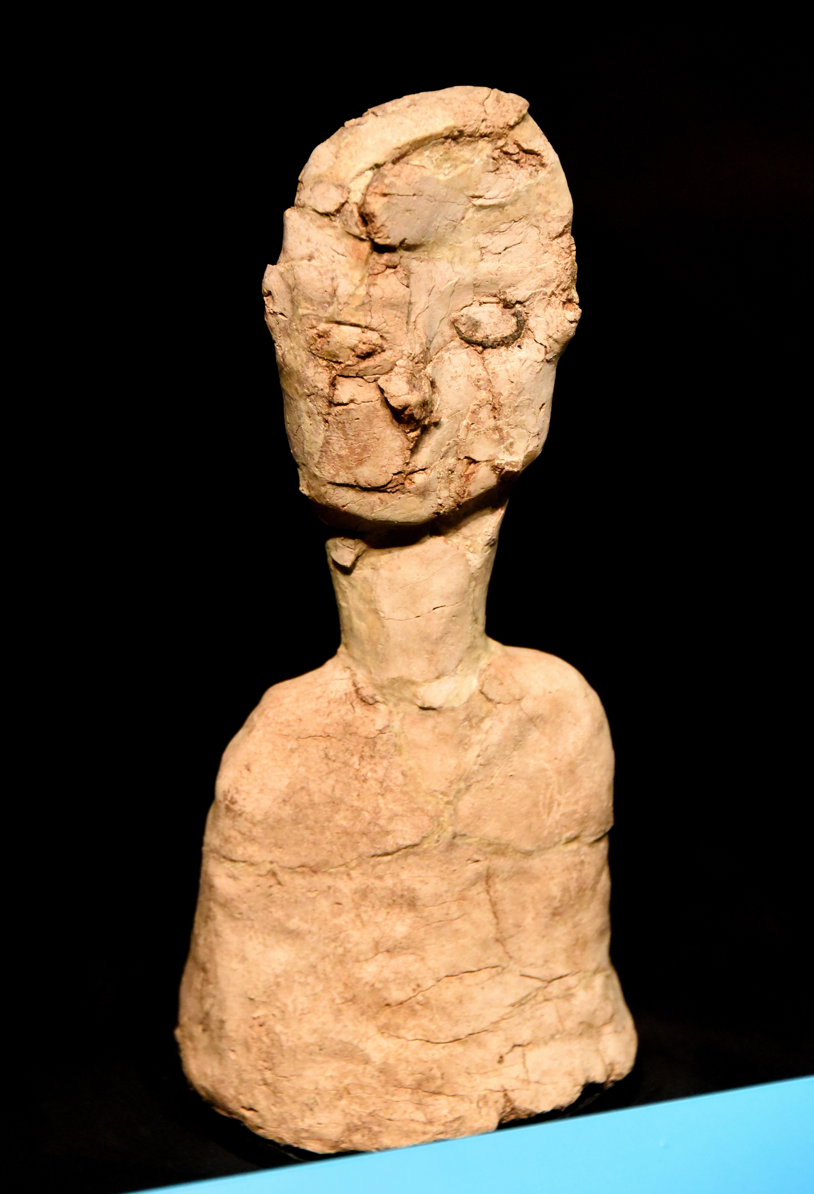 This statue (upper torso) was made of lime plaster, reed, and bitumen and was found in modern-day Ain Ghazal city in the outskirt of Amman, Jordan Hashemite Kingdom. Between 1983-1985 CE, 15 statues and 15 busts made of lime plaster and reed were found in two underground caches. These statues and busts (depicting human heads) are considered the earliest large-scale representations of the human form and are one of the most outstanding examples of prehistoric art from the Pre-Pottery Neolithic B period. All of them are in Jordan and are on display at the Jordan Archaeological Museum and the Jordan Museum; two are on display (as a loan) at the British Museum in London. Pre-pottery Neolithic period B, circa 7700-7500 BCE. (The Jordan Museum, Amman, Jordan).