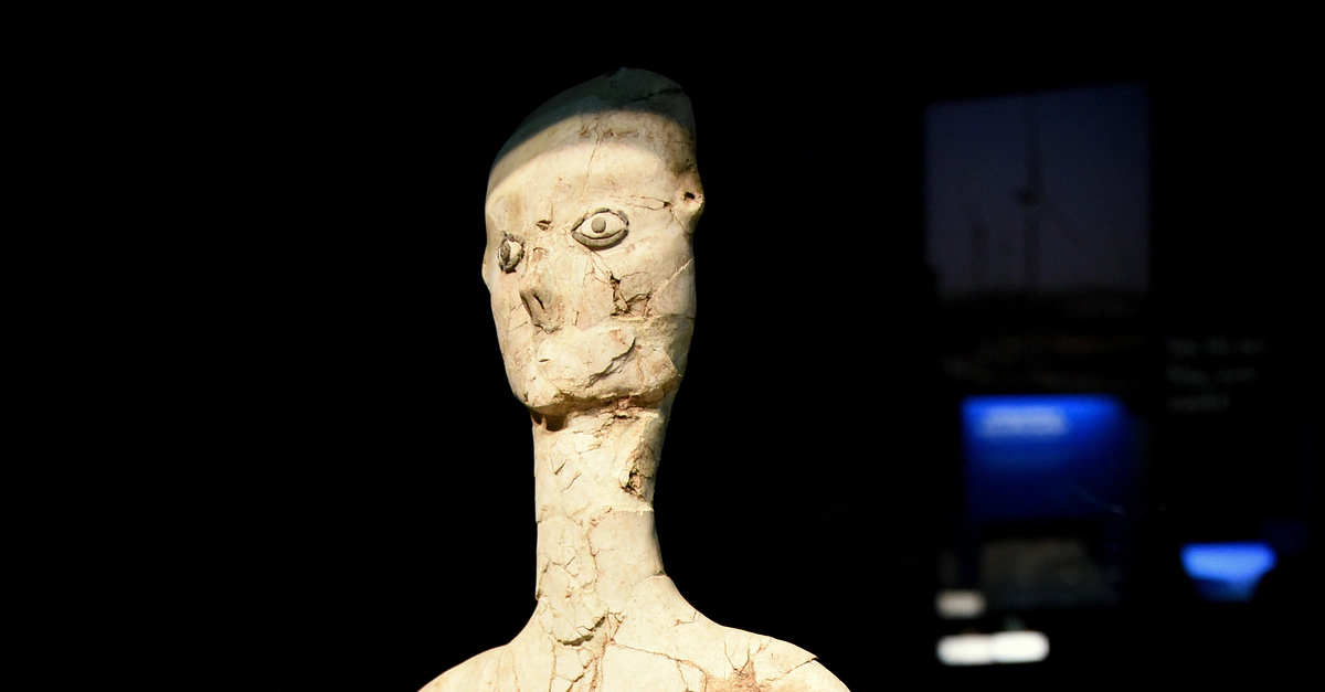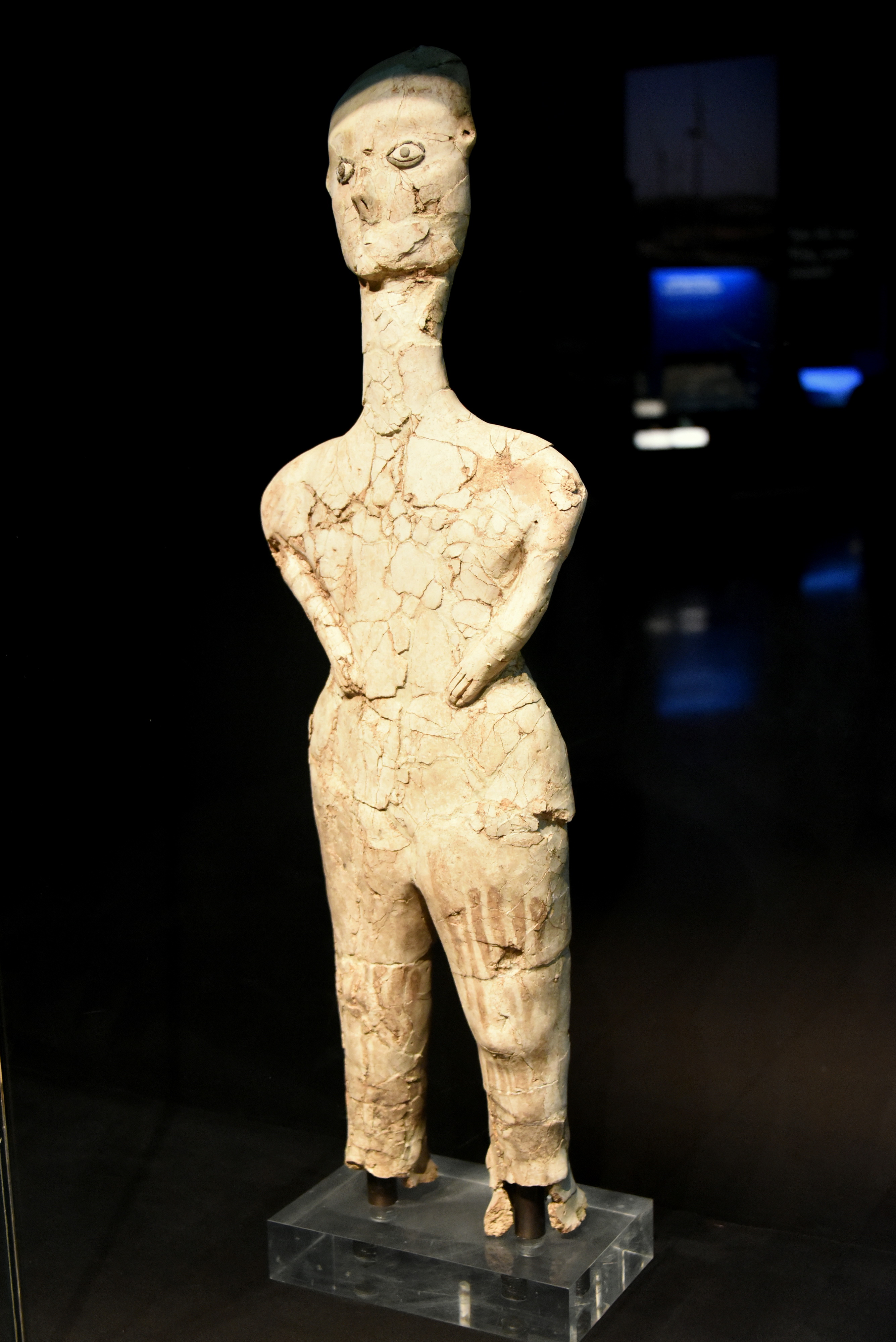 This statue was made of lime plaster, reed, and bitumen and was found in modern-day Ain Ghazal city in the outskirt of Amman, Jordan Hashemite Kingdom. Between 1983-1985 CE, 15 statues and 15 busts made of lime plaster and reed were found in two underground caches. These statues and busts (depicting human heads) are considered the earliest large-scale representations of the human being form and are one of the most outstanding examples of prehistoric art from the Pre-Pottery Neolithic B period. All of them are in Jordan and are on display at the Jordan Archaeological Museum and the Jordan Museum; two are on display (as a loan) at the British Museum in London. Pre-pottery Neolithic period B, 8th millennium BCE. (The Jordan Museum, Amman, Jordan).