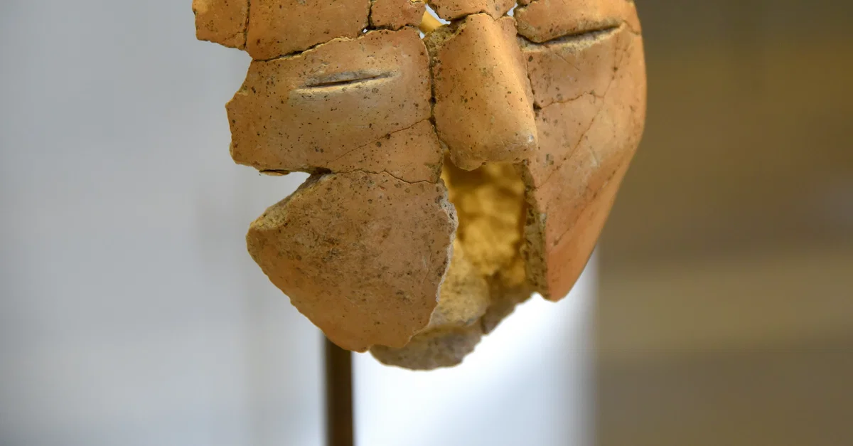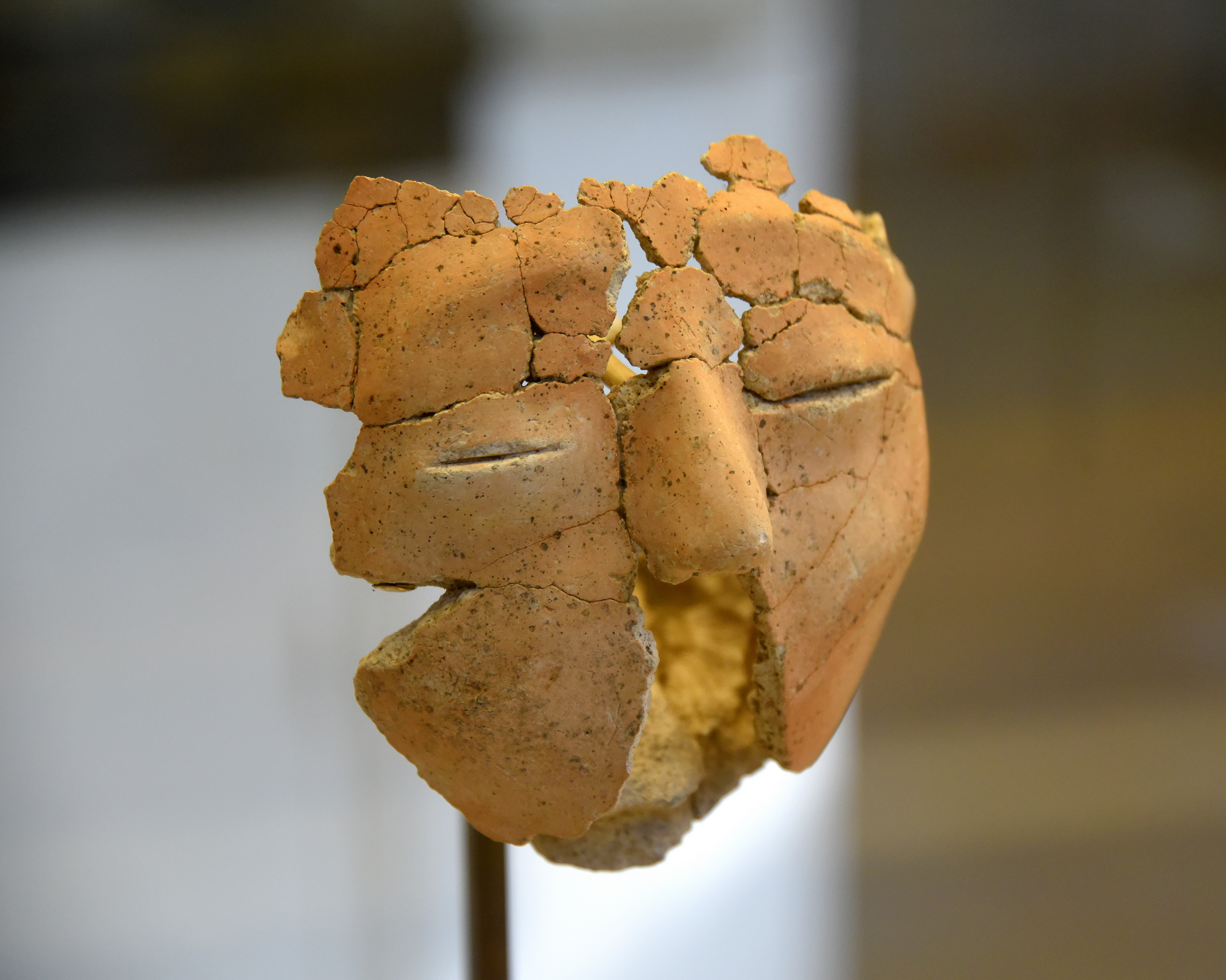 This plastered face was modeled on a human skull and was buried with a group of similar plastered faces. This mode of skull decoration was probably related to some sort of ancestor cult. From modern-day Ain Ghazal, outskirts of Amman, Jordan Hashemite Kingdom. Pre-Pottery Neolithic B, circa 6500 BCE. (The Jordan Archaeological Museum, Amman, Jordan).