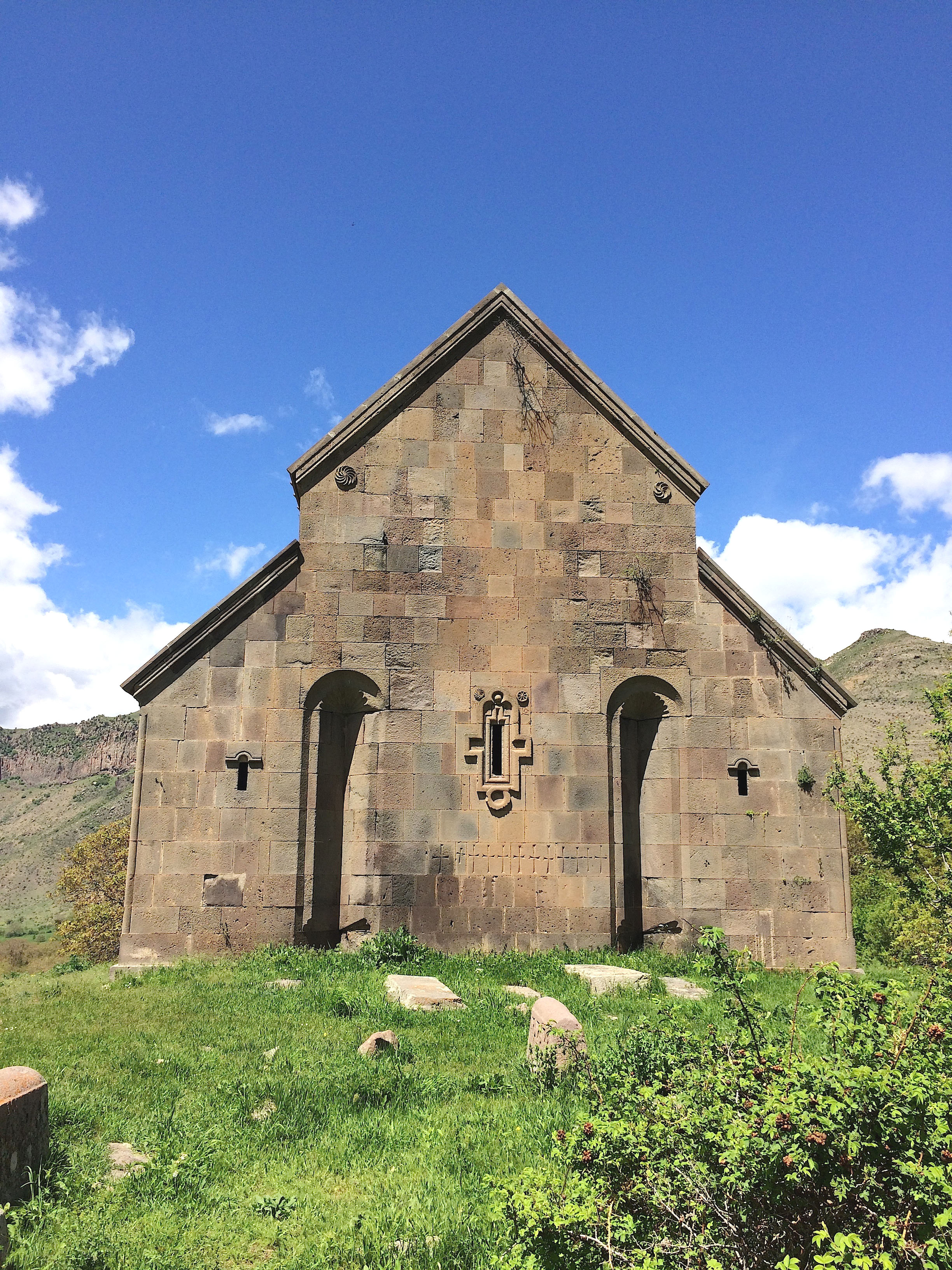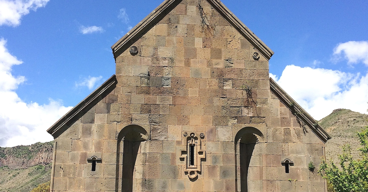 This is the backside of the Zorats Church. The Zorats Church is a church built on a hill overlooking the Yeghegis River in present-day Armenia. The church was built in the early 14th century CE and dedicated by Bishop Stepanos Tarsayitch who was a grandson of an Orbelian prince. Armenia was at this time a contested territory between various Turkish tribes. Zorats Church is unique among Armenian churches in that it has no inner hall — the only roofed spaces are the eastern altar apse and its two annexes, which are open to a large yard. The church is said to be created so that Armenian warriors could receive the sacrament and blessings before going to battle.