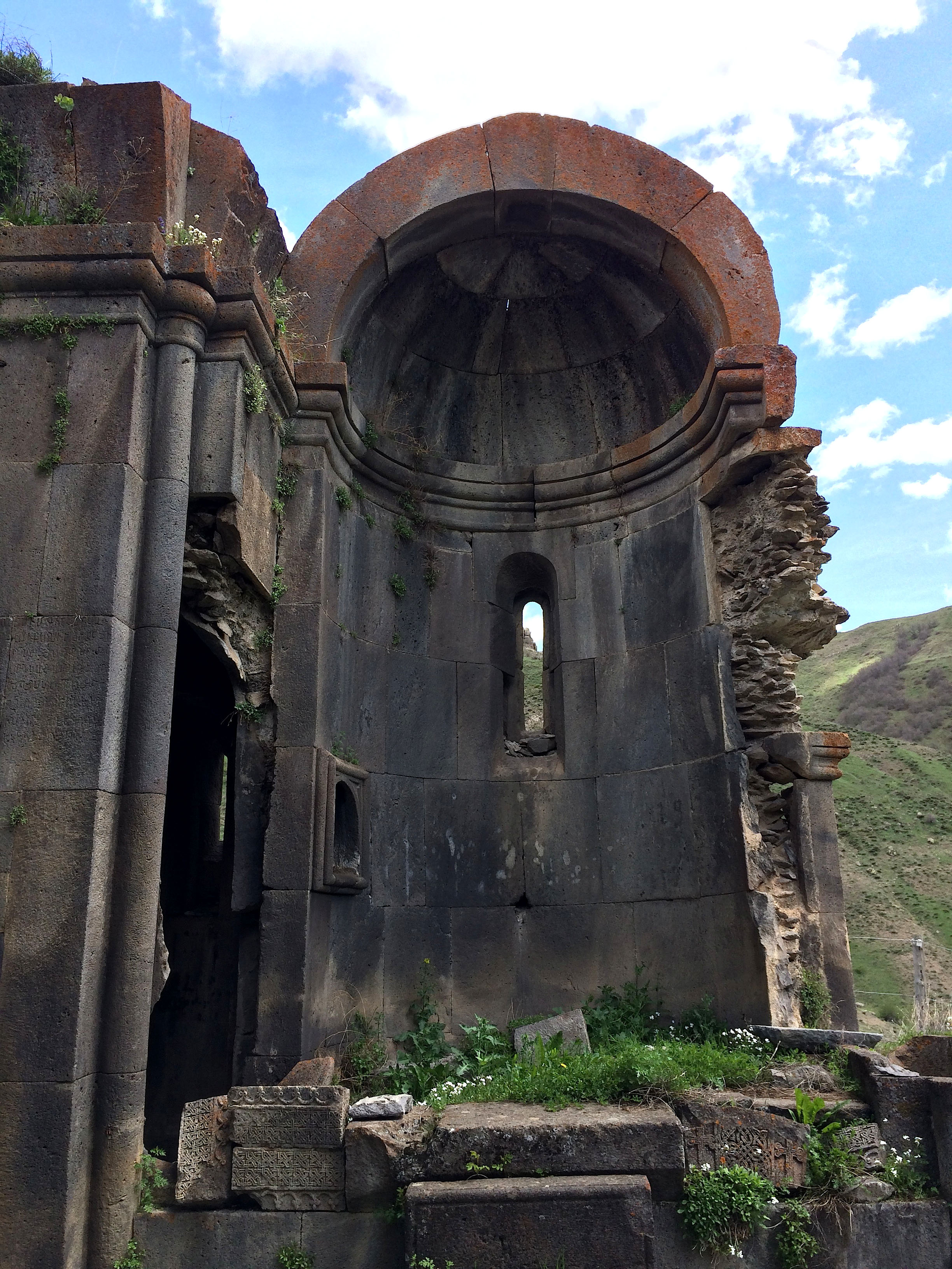 Arates Monastery in Armenia is built on top of a hill and overlooks the Arates tributary of the Yeghegis River. The monastery's name came from the combination of “ari” ("come" in Armenian) and “tes” ("see" in Armenian). The group of half-ruined monuments consists of the St. Sion and the St. Astavatsatsin Churches, and two gavits. It is likely that the site dates back to the 7th century CE, but the oldest inscription dates only to the 9th century CE. Most of the ruins date from the 10-13th centuries CE, and the khachkars and tombstones date from between the 10-17th centuries CE.