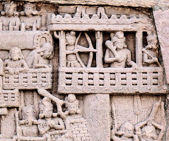 The Mallas defending the city of Kushinagara (detail from the “War over the Buddha’s Relics” image given below). Significance: It shows close details of a siege in progress, during the period of Ajatashatru, hence a visual aid to understanding the warfare of the period—siege warfare in particular. Location: South Gate (rear bottom architrave), Stupa no.1, Sanchi, Madhya Pradesh, India.
