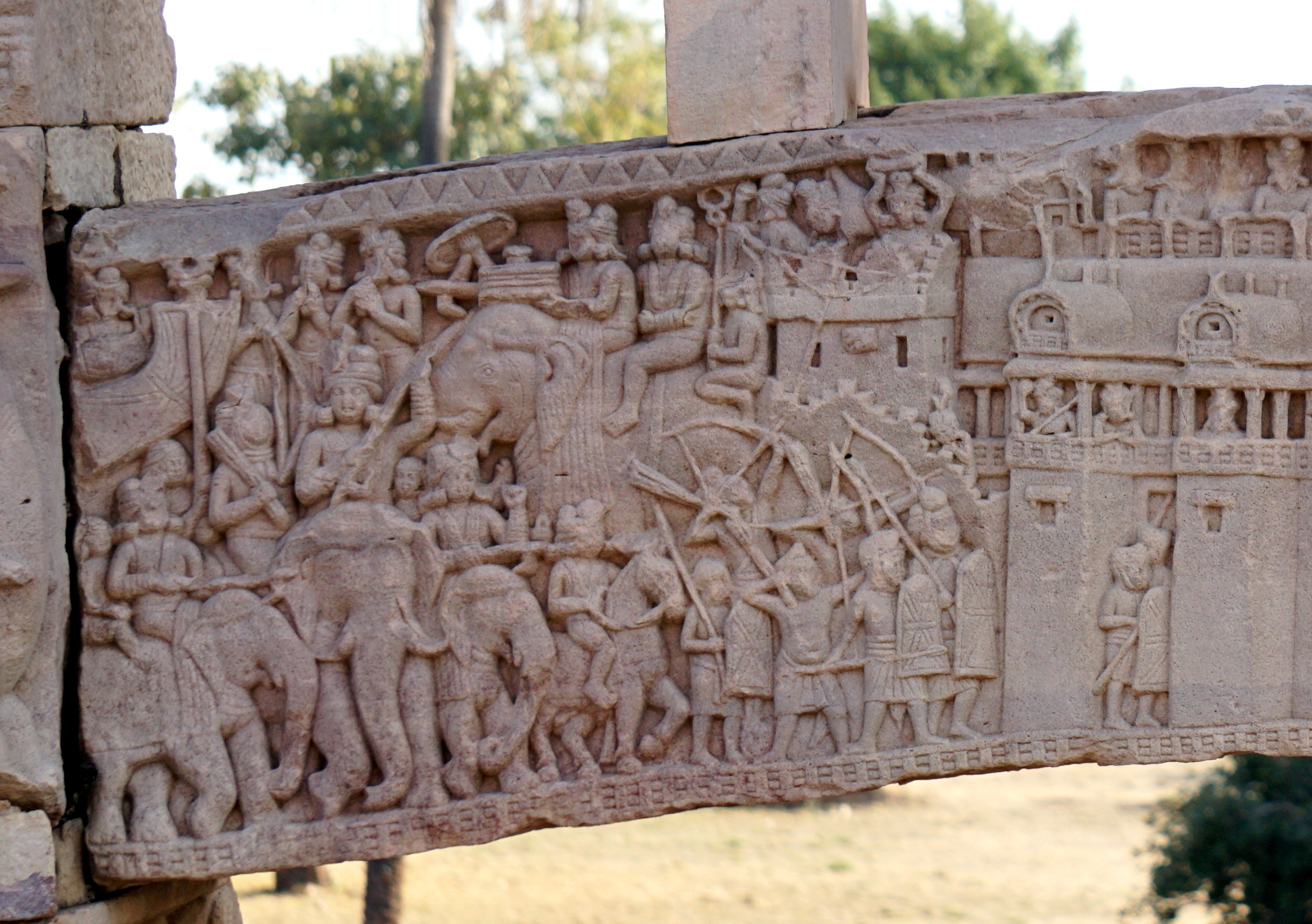 Details of what soldiers’ arms and armour as well as soldiers themselves in action would have looked like in the 5th century BCE. In all probability, this is how the Magadhan soldiers looked. Details taken from the “War over the Buddha’s Relics” sculpture. Location: South Gate (rear bottom architrave), Stupa no.1, Sanchi, Madhya Pradesh, India.