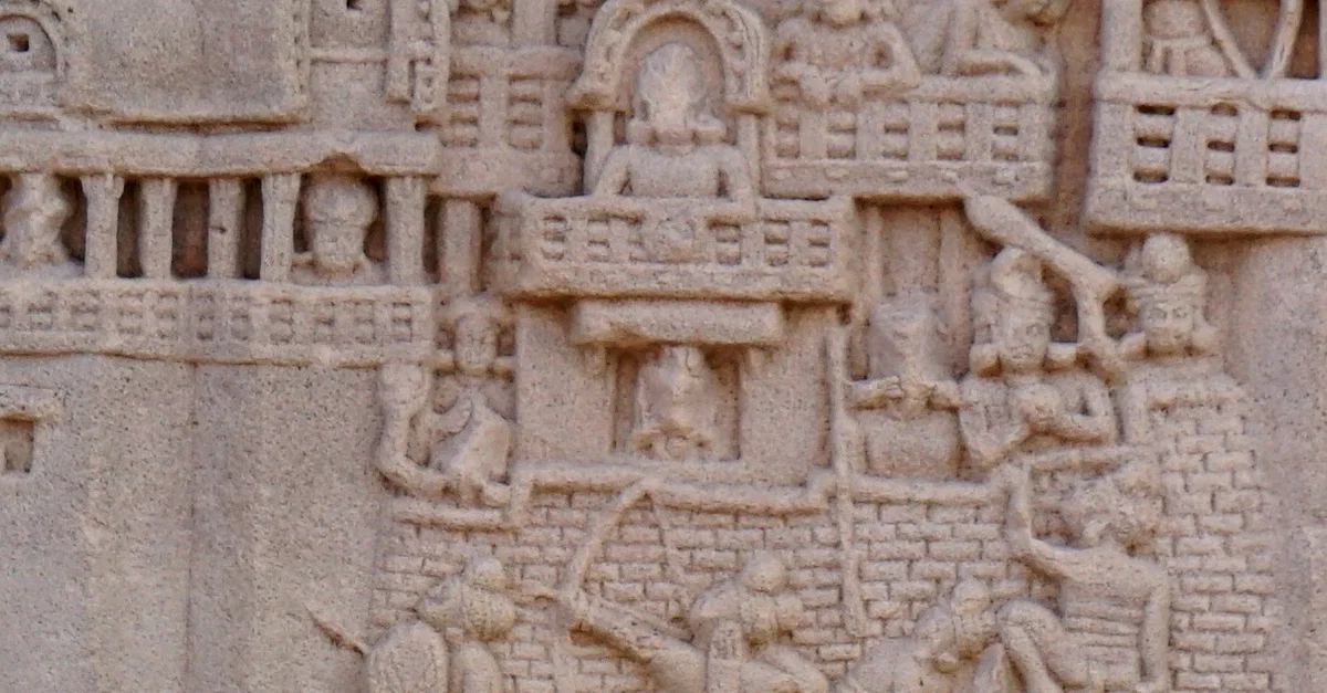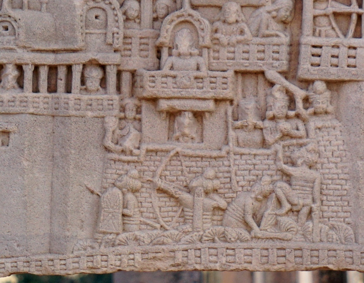 Details of what soldiers’ arms and armour as well as soldiers themselves in action would have looked like in the 5th century BCE. In all probability, this is how the Magadhan soldiers looked. Details taken from the “War over the Buddha’s Relics” sculpture. Location: South Gate (rear bottom architrave), Stupa no.1, Sanchi, Madhya Pradesh, India.