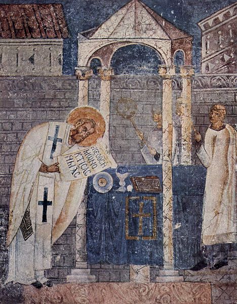 Located at the Cathedral of Ohrid, Macedonia, this fresco, from the 11th century CE, depicts Saint Basil (Basil the Great) blessing gifts in the Divine Liturgy. Basil was born c. 330 CE and died 379 CE.