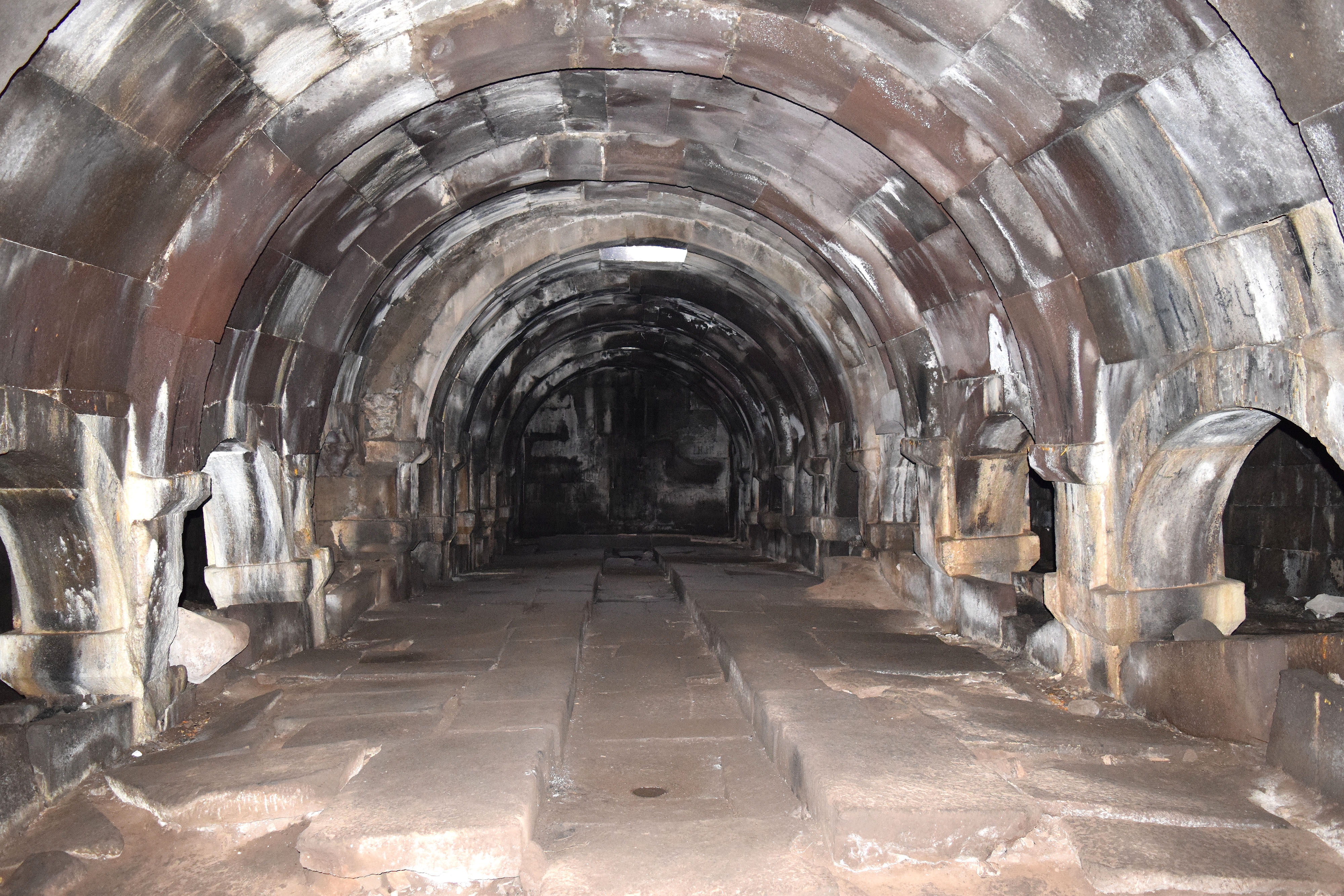 This medieval caravanserai located in present-day Armenia is located on the ancient Dvin Partav international trade route, which included the Selim Mountain Pass. (It was part of the ancient Silk Road.) Built from basalt in 1332 CE, it is 41 m (135 ft) long. It is a three-nave hall that adjoins a vestibule and a domed-chapel at the east end. Fourteen pylons divide the hall into three naves that feature half-round vaults below the pitched roof.