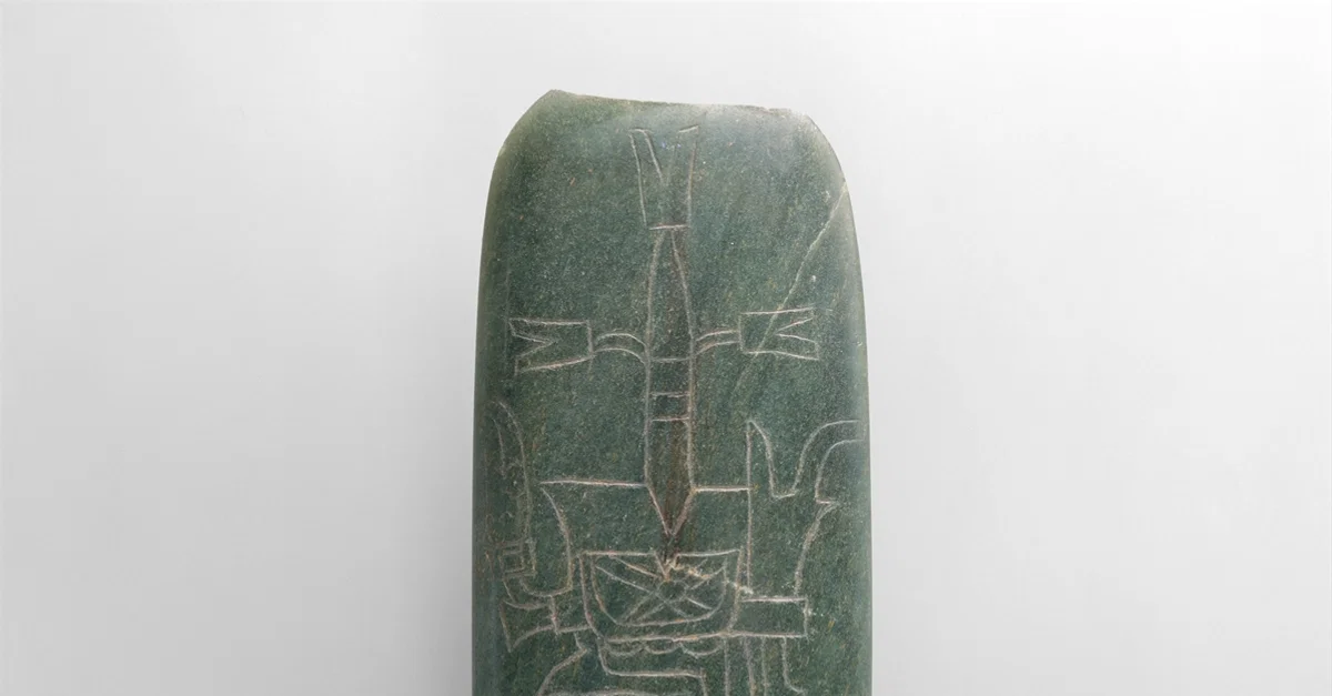 Jadeite celt, 10-4th century BCE, Mexico, Mesoamerica Metropolitan Museum of Art About 1000 BCE, celts-elongated, elliptical ground stone tools-would acquire meaning beyond their workaday function. When made of greenstones such as the hard, polishable jadeite, celts symbolized ears of maize. The profile image incised on the upper portion of this celt is that of the Olmec maize god, identifiable by the tall tripartite element emerging from the cleft in his headdress.