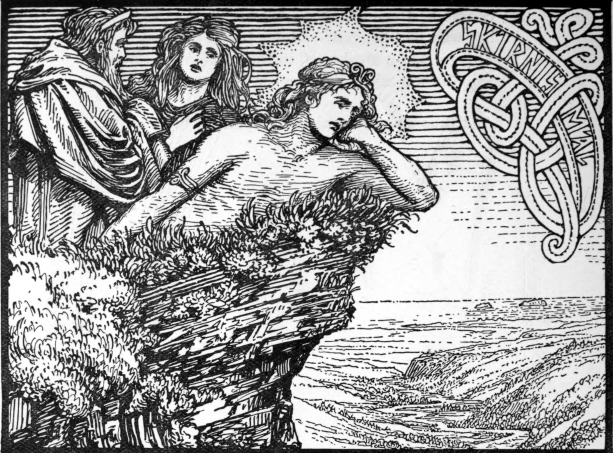 Artist's depiction showing the Norse god Freyr gazing out from atop Odin's high seat to Jotunheim, realm of the giants, where he espies the giant-daughter Gerðr walking across her garden and instantly falls in love with her. This tale is recorded in the Skírnismál ('lay of Skírnir'). This particular depiction is titled 'The Lovesickness of Frey' and appears in 'The Elder or Poetic Edda; commonly known as Sæmund's Edda.' Edited and translated with introduction and notes by Olive Bray. Illustrated by W.G. Collingwood (1908).